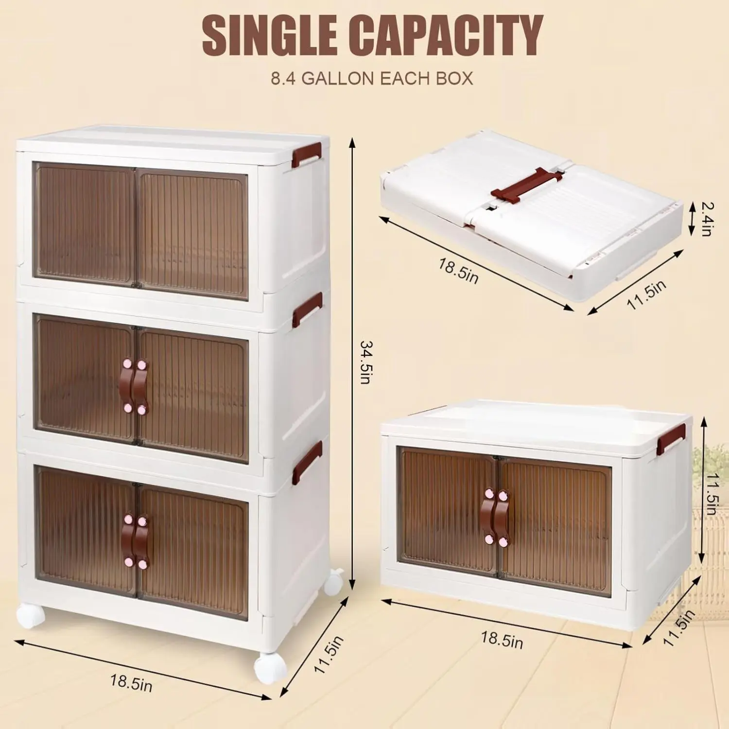 Professionally designed, these organizers can hold up to 110 lbs (50 kg) with a capacity of 8.4 gallons. The dimensions are 18.5"L x 11.5"W x 34.5"H, making them space-saving for home storage. Ideal for closets, kitchens, or bedrooms, these bins are a must-have for organized living spaces.