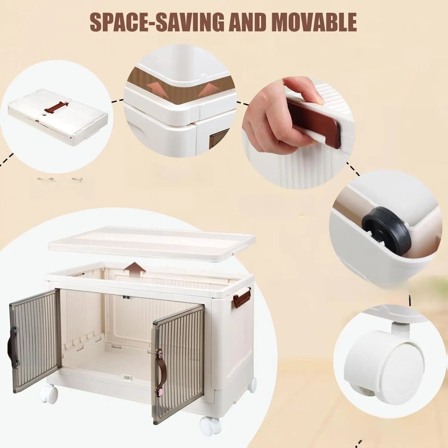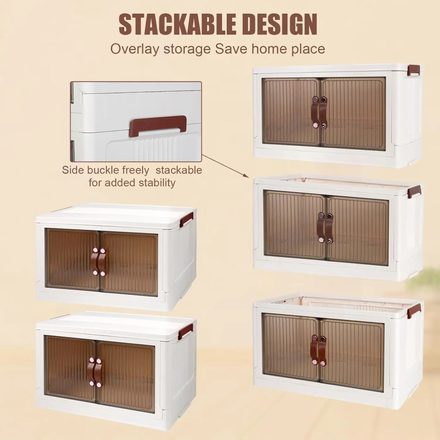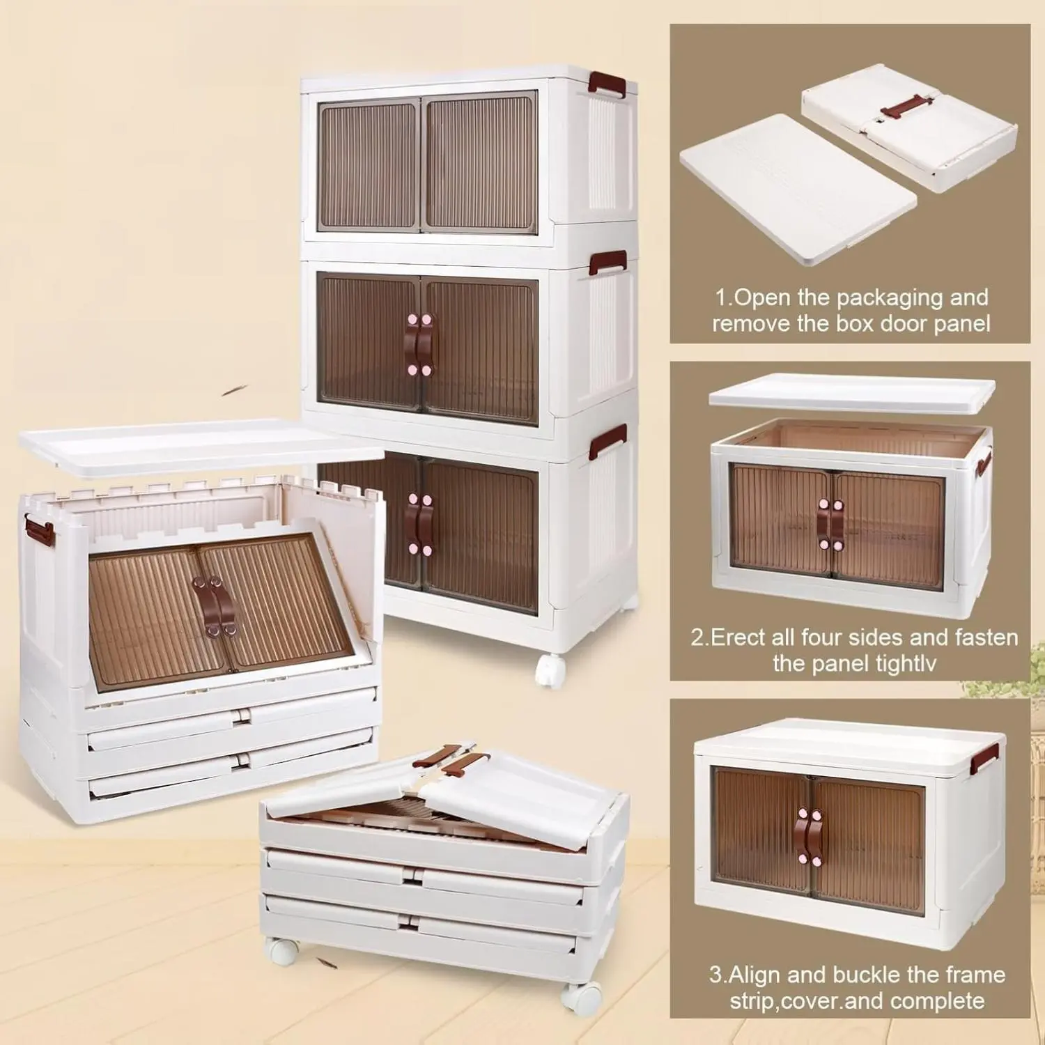 The storage box can be opened from the top or front door. It features two clear transparent doors for quick visibility. The front door includes a double-opening magnetic closure, preventing dust exposure. Both openings provide convenience, ensuring easy access to your stored items.