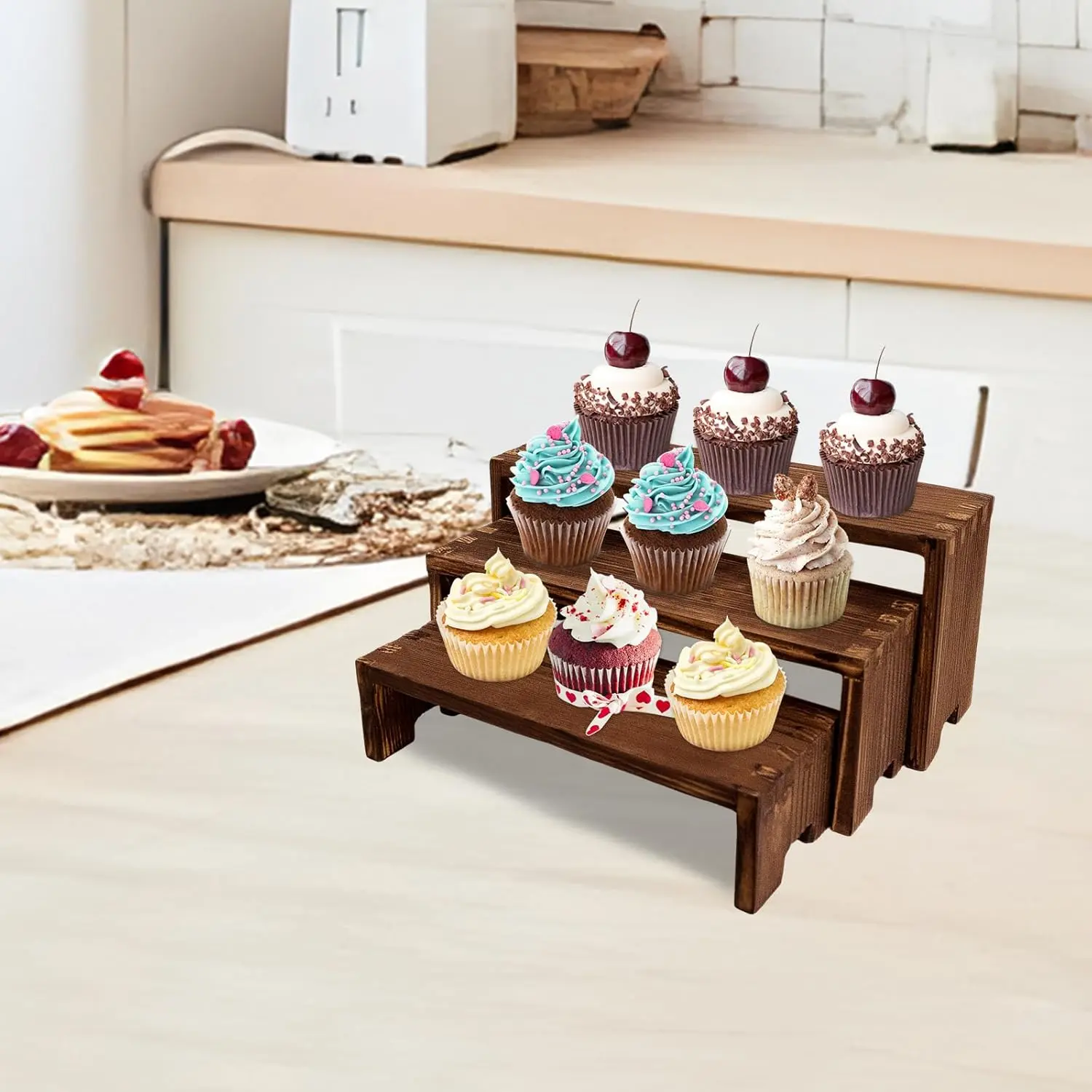 【Wooden Tierd Risers for Display】🎁: This 2 set 3 tier small display shelf for cupcakes or vendors has stackable nesting design, so the wooden display risers easily access as desktop storage racks,also they has load-bearing capacity for more kinds perfumes, collectible figures,kitchen condiment bottles, bathroom toiletries because of varieties size of (L7.8''/20cm-8.6''/22cm-9.4''/24cm)XW2.9'' /7.3cm