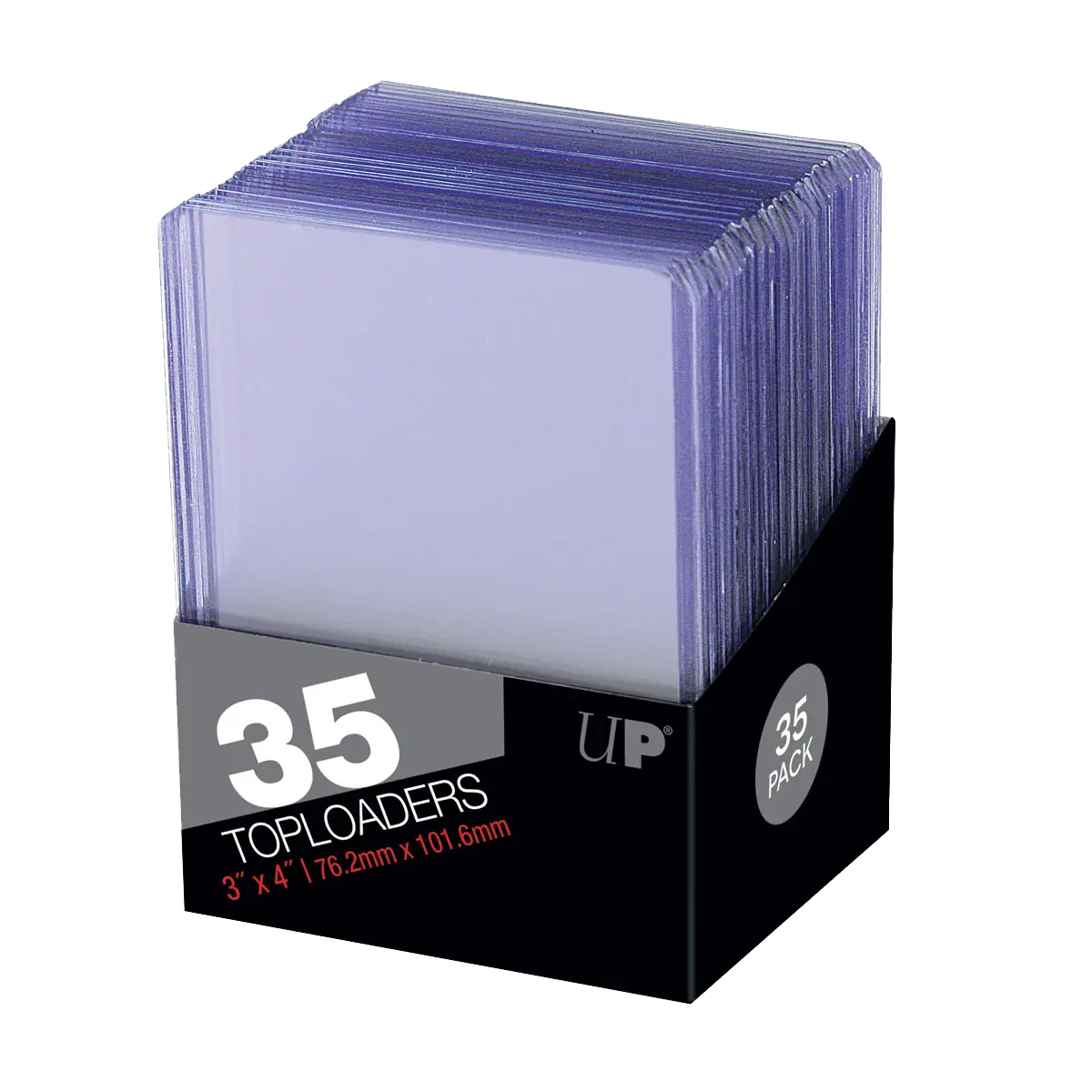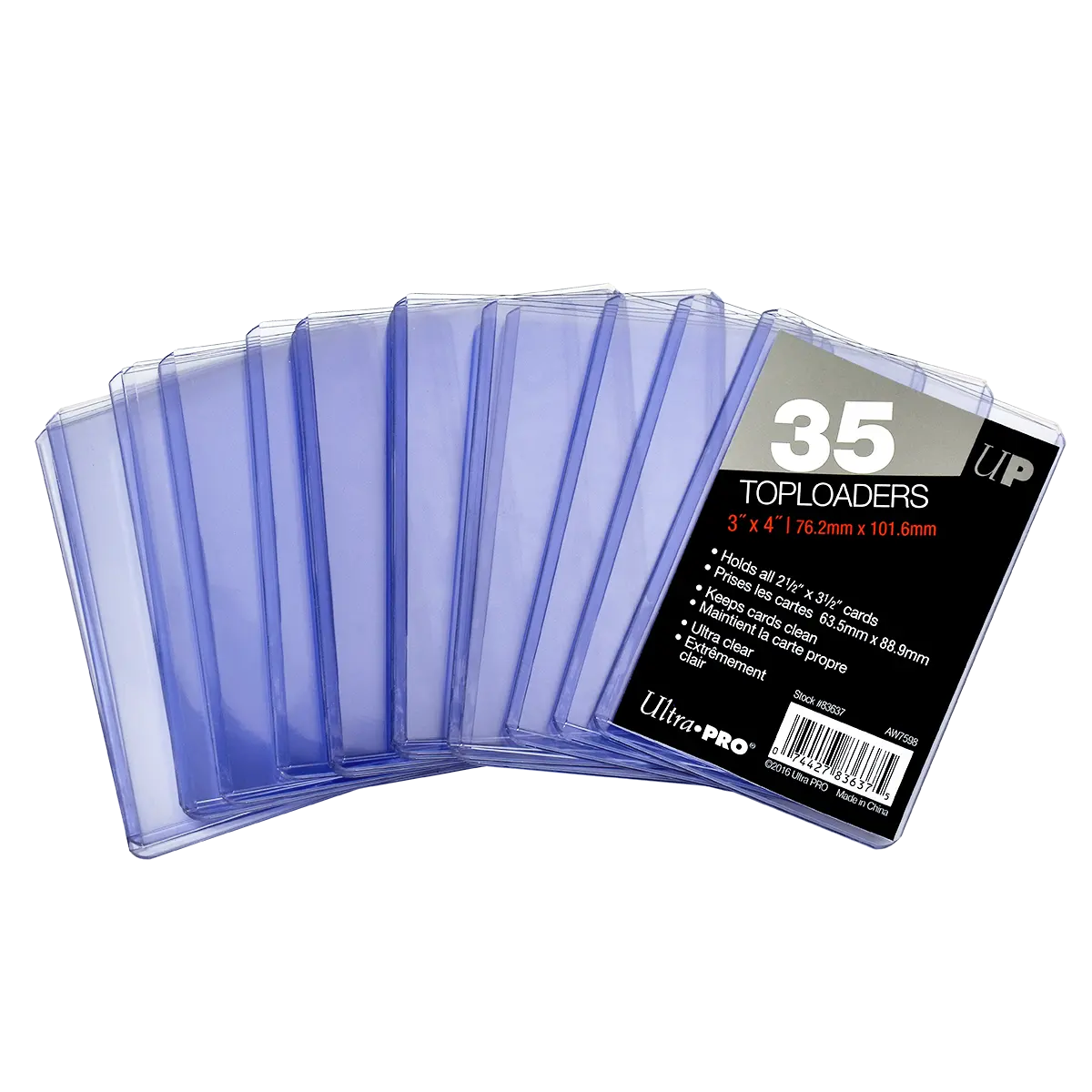 Protect your valuable collectible trading cards with the original Ultra PRO Toploaders! These rigid plastic protectors are made with super clear PVC to keep your cards safe for storage, display, during trade, and in shipments. With outer dimensions of 3" x 4", these toploaders are designed to safely store standard size cards (2-1/2" x 3-1/2") up to 35 points in thickness. Each pack comes with 35 individual toploaders.