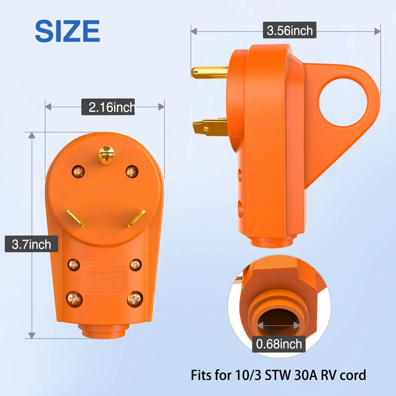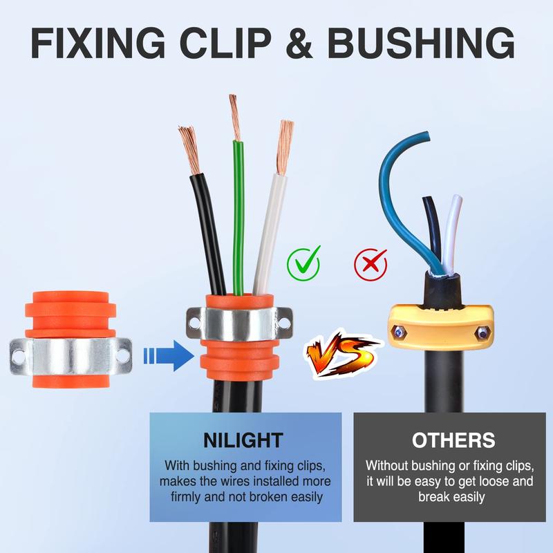 ·Superior Quality: Adopts high heat and durable heavy-duty ABS plastic housing, Constructed with high quality terminals and blades, inner strain relief clip and outer bushing firmly secure cable,ensuring high conductivity and a solid, safe construction for replacing 30 AMP plug on extension cord.