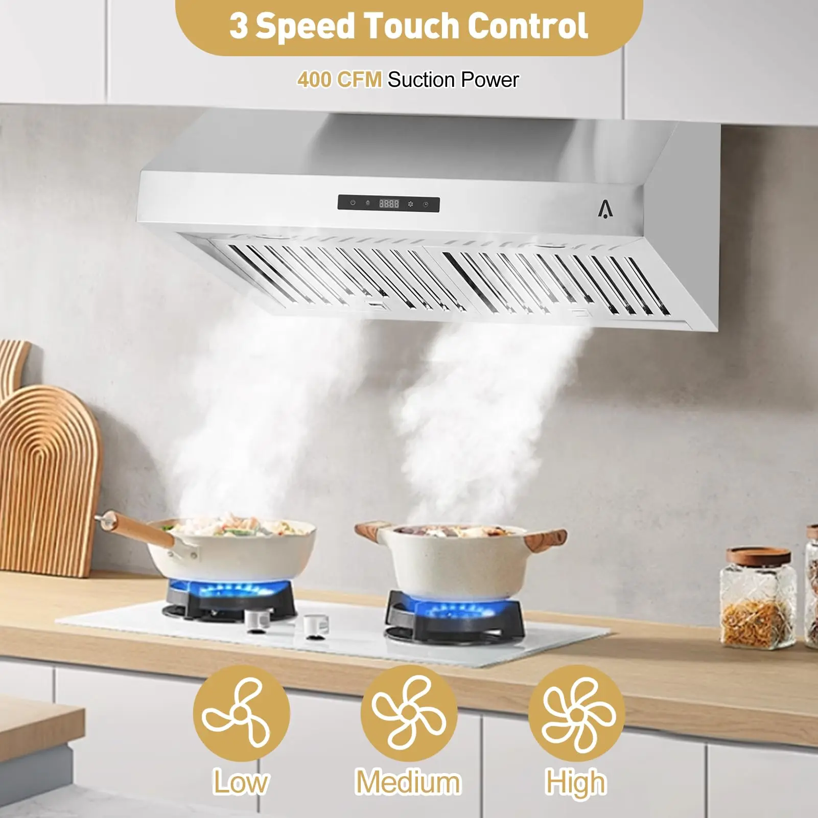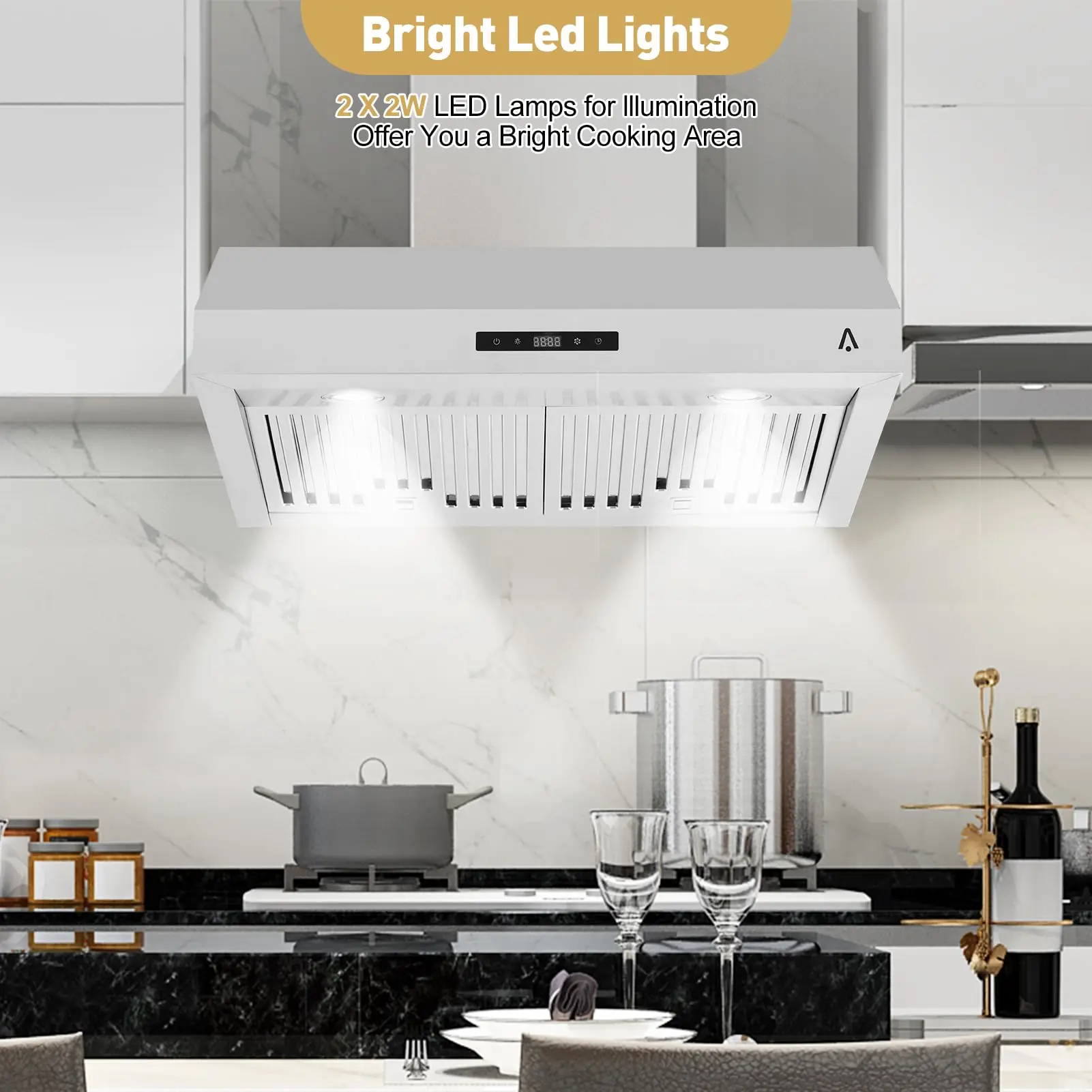 · Easy to Operate: The range hood adopts touch control, easy to open and close, low/medium/high speed buttons suitable for different cooking methods. Two 2W LEDs provide enough brightness to meet your cooking needs. Quiet operation keeps noise levels below 69dB at high speeds.