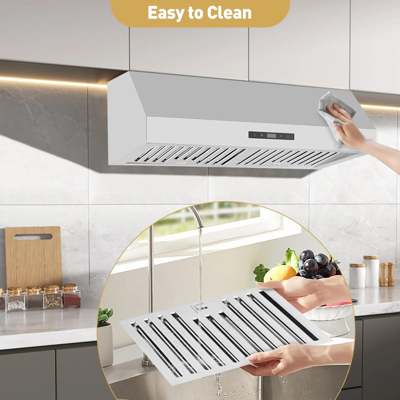 · Premium Multi-Layer Filtration: The under-cabinet range hood is made of high-quality stainless steel with excellent resistance to corrosion and rust. And includes a reusable steel baffle filter that more effectively captures grease and oil.