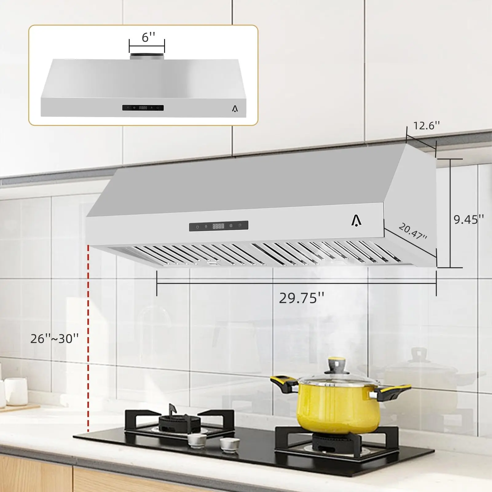 · Excellent Luxury Design: Transform your entire kitchen with a plug-in range hood. Product Dimensions: 29.75" (W) x 16.69" (D) x 9.45" (H). Electrical: 120V/60Hz, 6-inch dome vent.