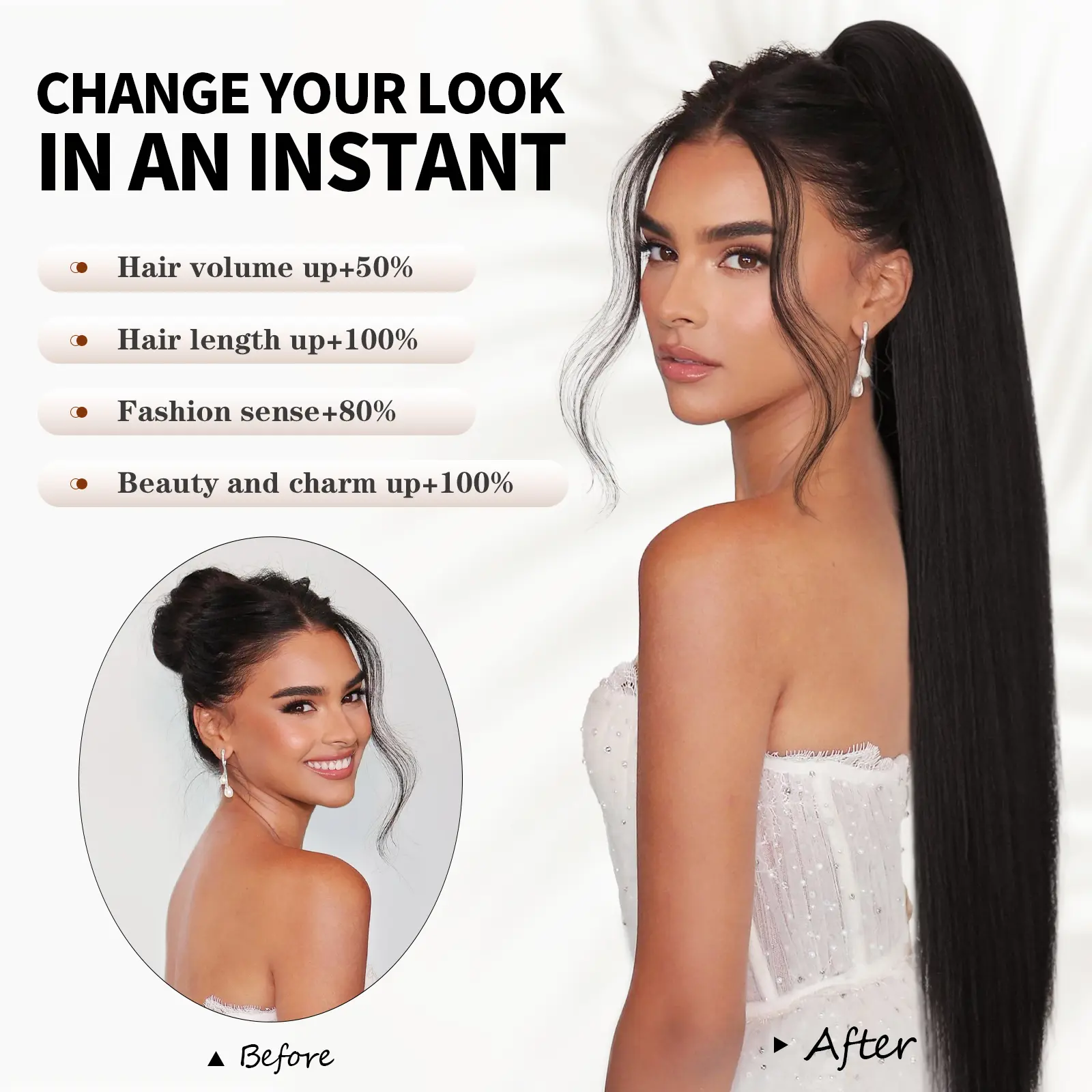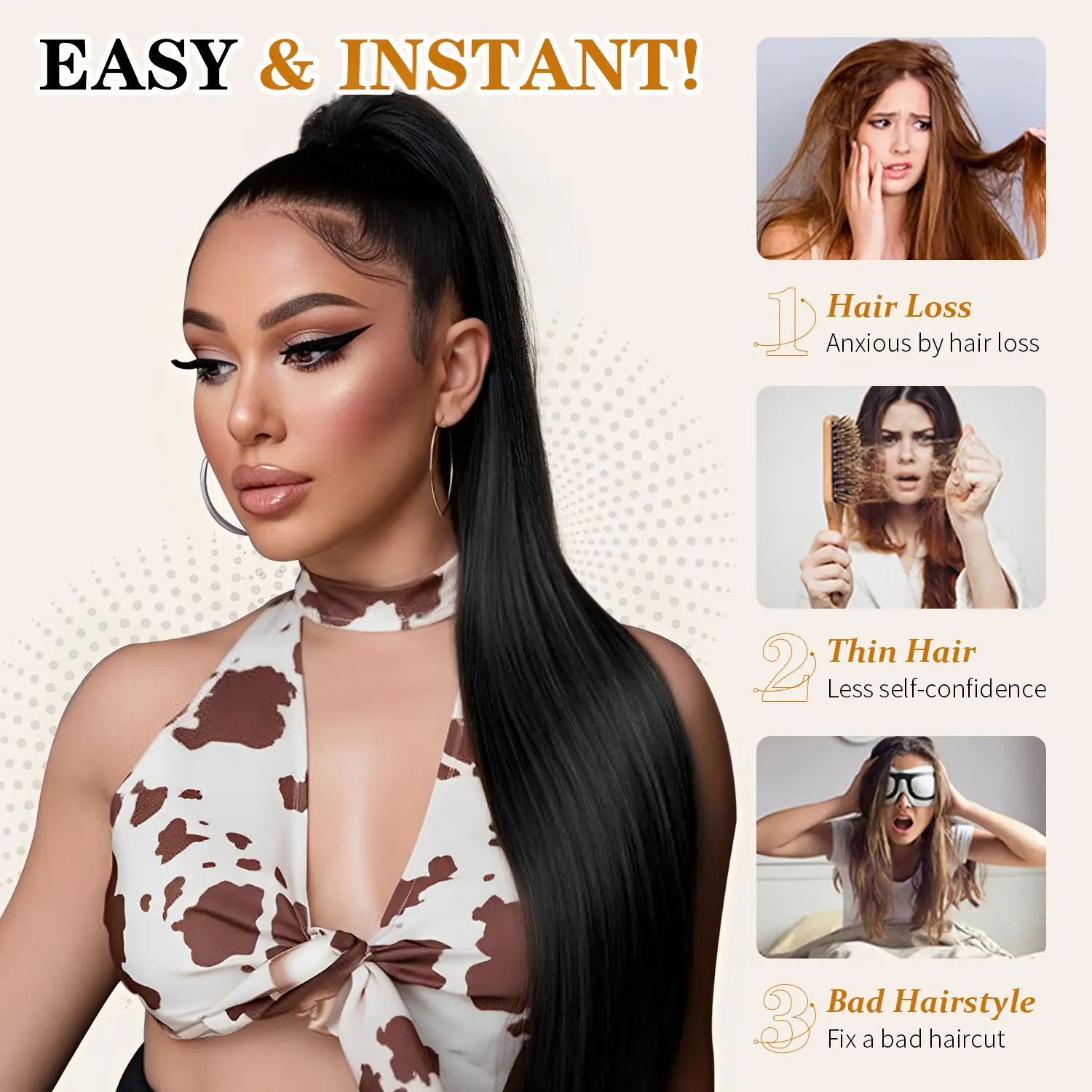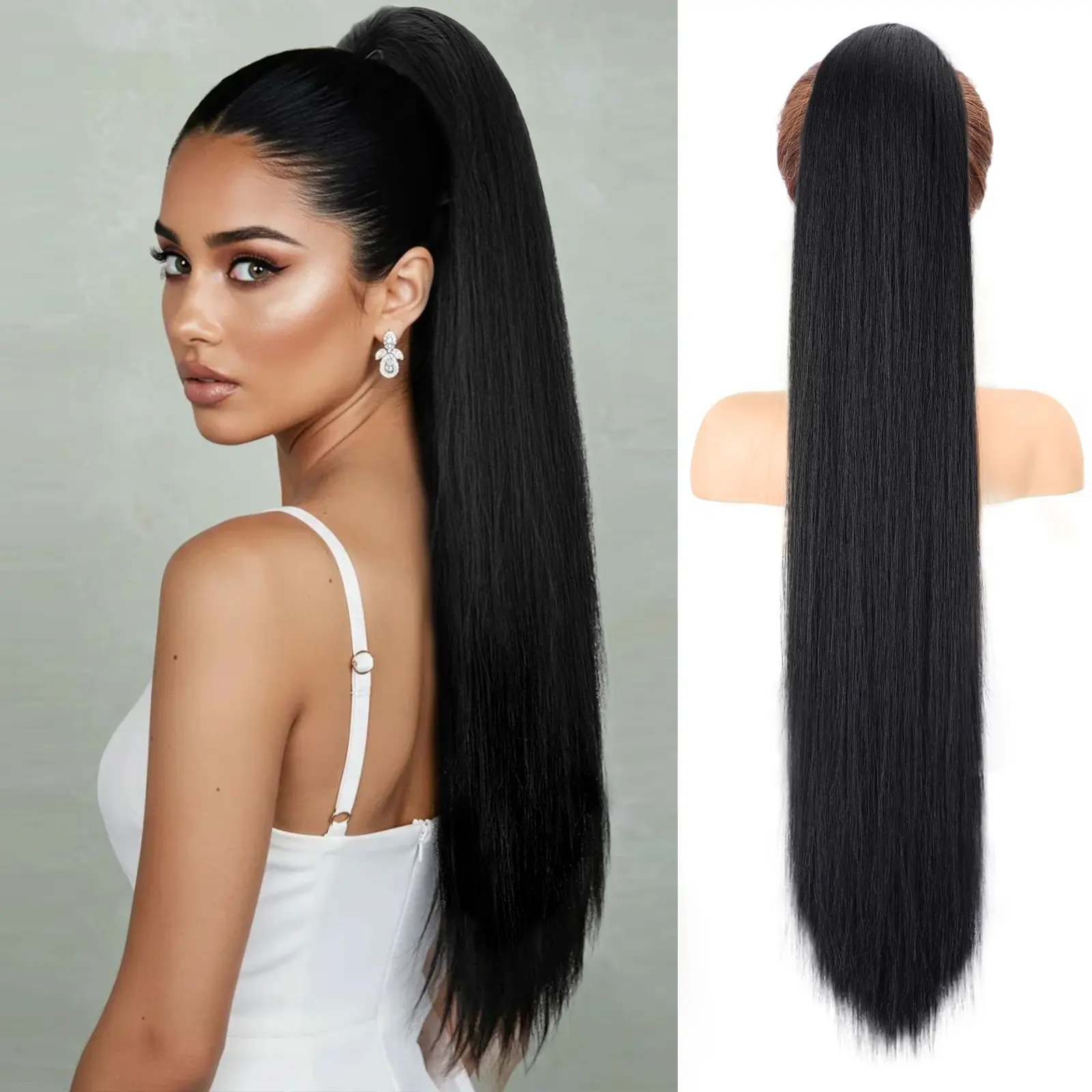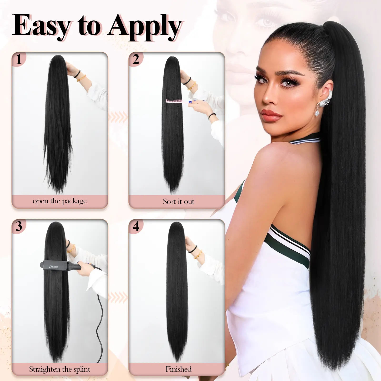 This long ponytail is perfect for those days when you want a bold hairstyle without the hassle. It looks natural, has a gorgeous length, and just the right shine to blend in like real hair. Easy to apply and very secure. I use low heat to straighten it perfectly when out of box. A total go-to!