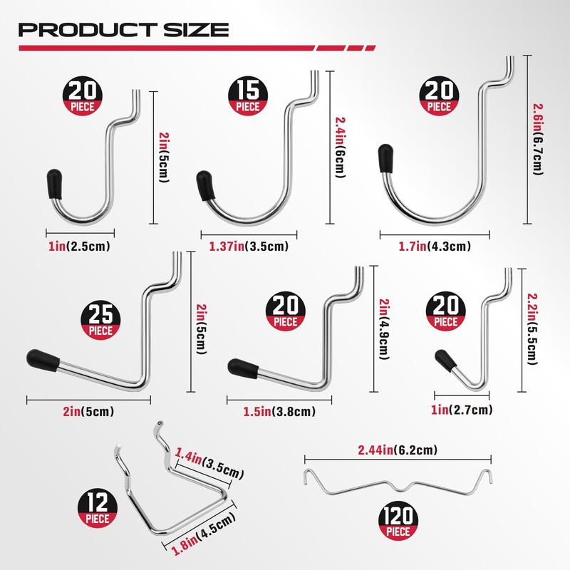 ·UNIVERSAL COMPATIBILITY - Designed to fit both 1/8" and 1/4" pegboards with 1" spacing, this versatile pegboard hook set securely holds tools, bins, and hangers, making it the ultimate peg board organizer for any setup.