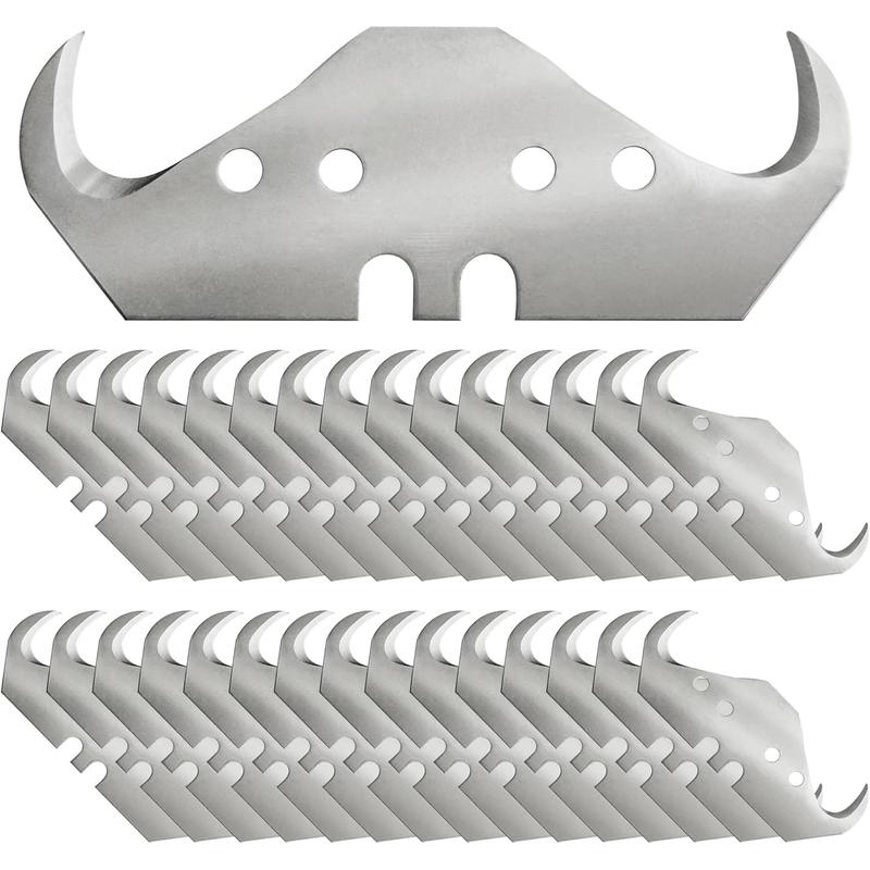 HIGH-QUALITY MATERIAL:Our multifunctional hook knife is made of SK5 carbon steel, which has high hardness, is strong and wear-resistant, and is not easy to deform. The blade is finely polished, sharp and durable. In addition, the hook-shaped design of the blade can buffer the cutting force, so that the blade is evenly stressed, the blade is not easy to break, and the life of the blade is extended.·EFFICIENT AND SMOOTH CUTTING:The hook-shaped design of the hook blade makes the sharp part recessed inside the blade, ensuring efficient and smooth cutting, and even if the blade falls accidentally, it will not hurt any part of the body. At the same time, the direct contact between the hand and the blade is reduced, which greatly improves safety.·WIDE RANGE OF USES:Sharp hook-shaped blades are widely used in our daily life and are very suitable for cutting and trimming various thick materials, such as felt (carpet), fabric, wallpaper, integrated ceiling materials, hard plastic, leather, thin aluminum products, metal plates, cardboard, etc.·UNIVERSAL SPECIFICATION DESIGN:The specifications of each blade are 53*18.5*0.65mm (2.08*0.72*0.02in), 2 super big hook, 4 hole double sided. The package contains a storage box for easy storage. Each box contains 30 PCS blades. These blades are universal for most utility knives on the market, can cut quickly, and are easy to use.It is an essential utility knife in your tool kit.·BUY WITH CONFIDENCE:Our products are strictly inspected before leaving the factory, and we provide after-sales service for each product. If you have any questions, you can send us an Email at any time, our after-sales team will give you a satisfactory solution as soon as possible after receiving the Email.