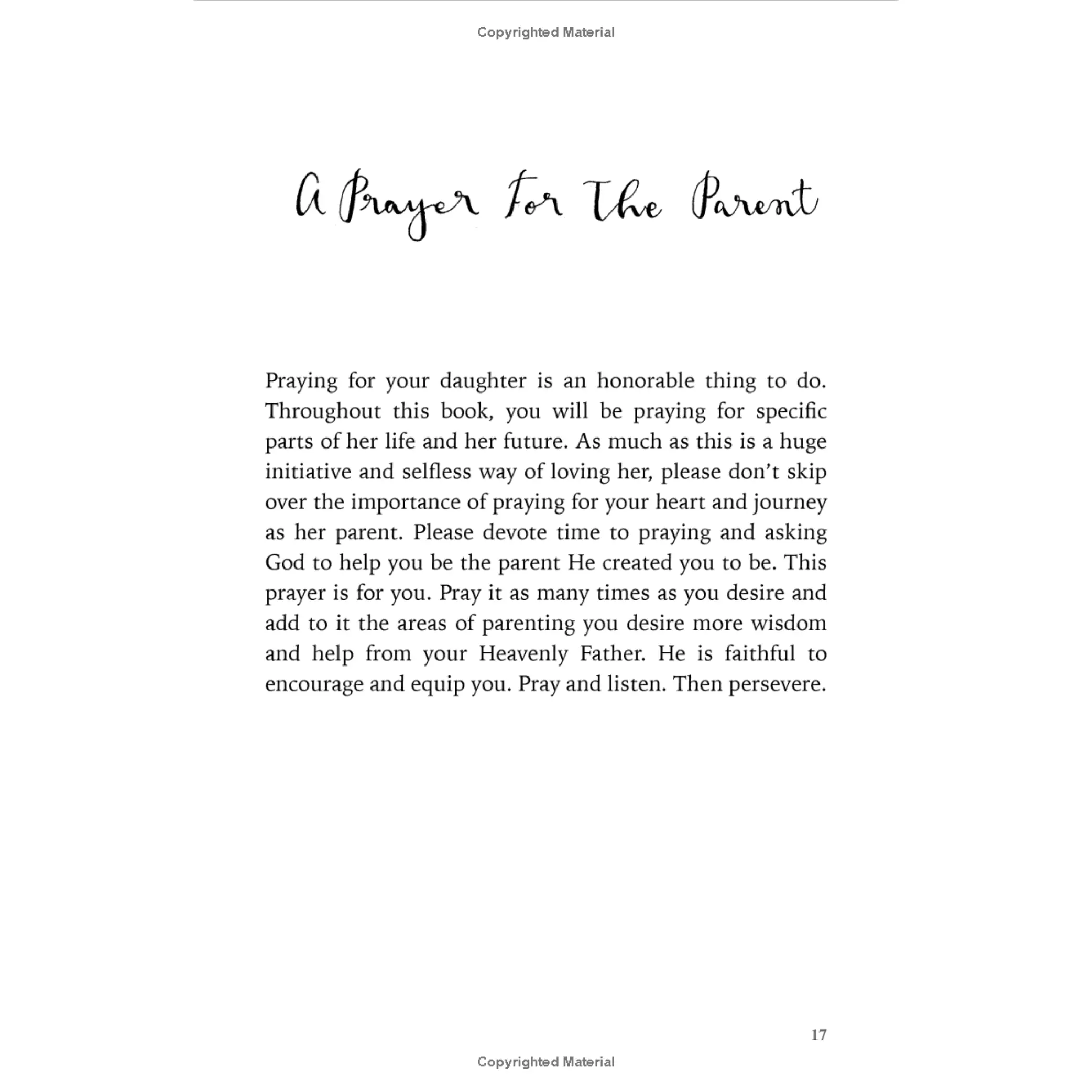 Pray for your daughter with this essential resource. Parenthood is a marvel, and God created a unique bond. Purpose your heart daily to pray for your daughter, seeking God's perfect will. This book guides you through thirty-one specific prayers. It helps you learn how to pray, inspire you for her needs, and challenge you daily. Embrace intimacy with God as you pray.