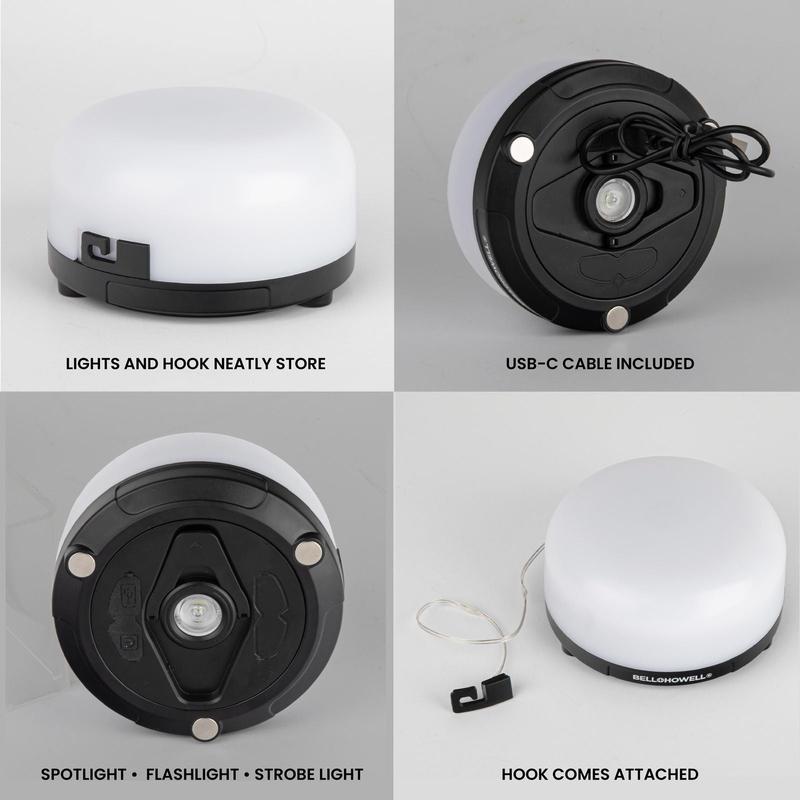 ·Bell + Howell Retractable LED String Light System Includes:32' ft of retractable RGB LED string lights housed inside of a spotlight dome (80 bulbs)USB-C charging cableDimensions: Diameter 4.3", Height 2.4”