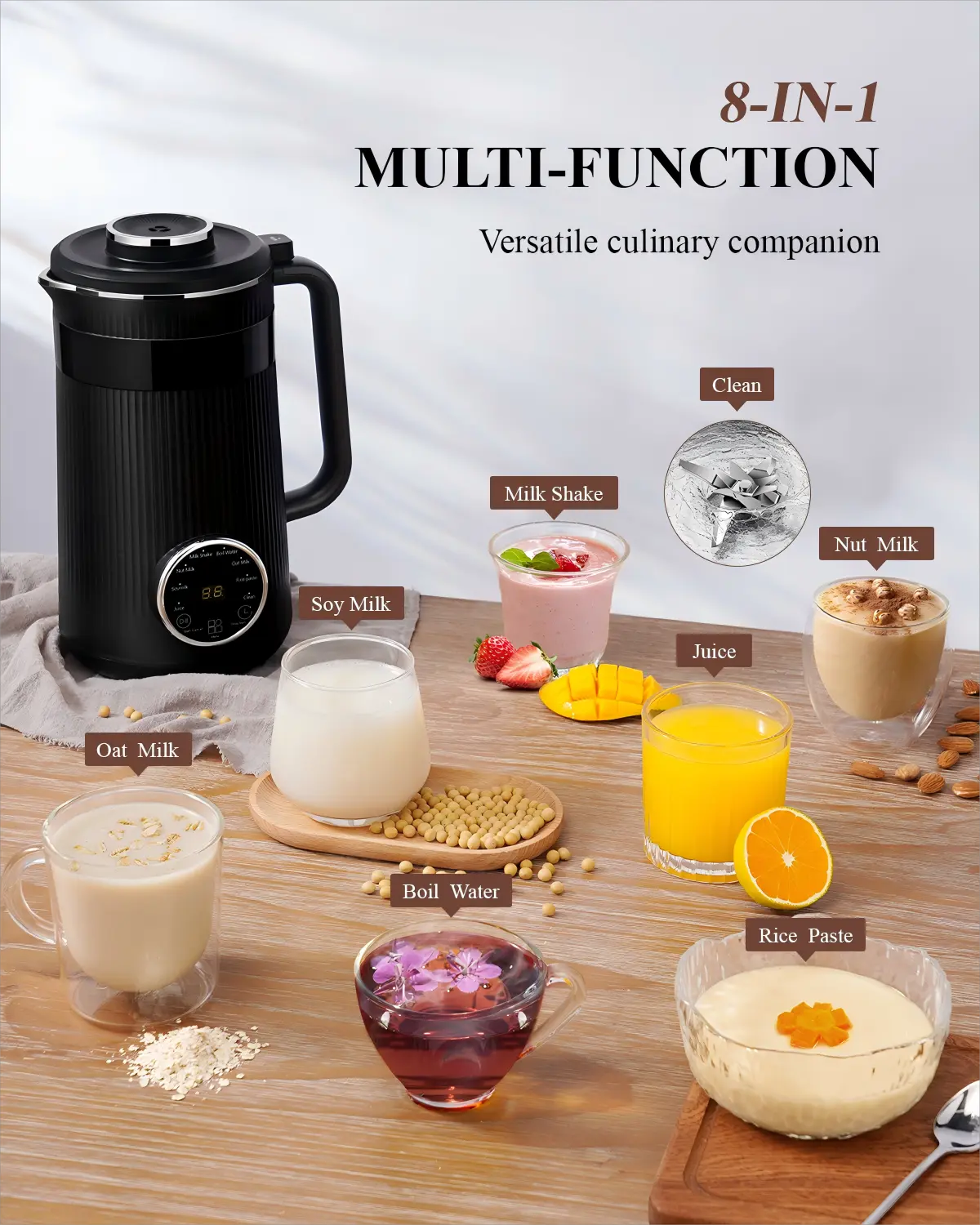 【Versatile 8-in-1 Functionality】: This Nut Milk Maker offers eight different functions, from crafting nut milk and oat milk to preparing rice paste and boiling water. It's your all-in-one kitchen companion for creating a wide range of healthy beverages and dishes.