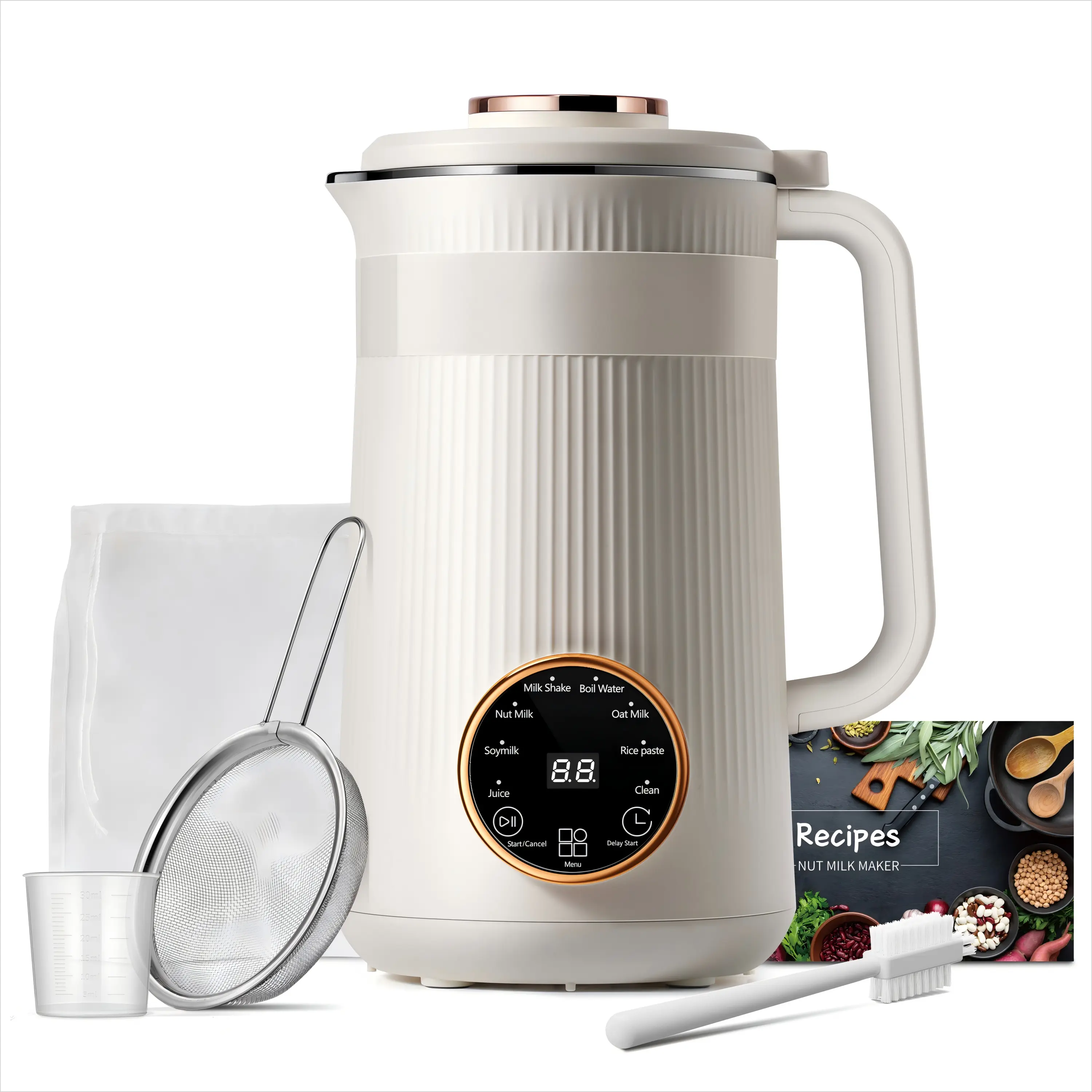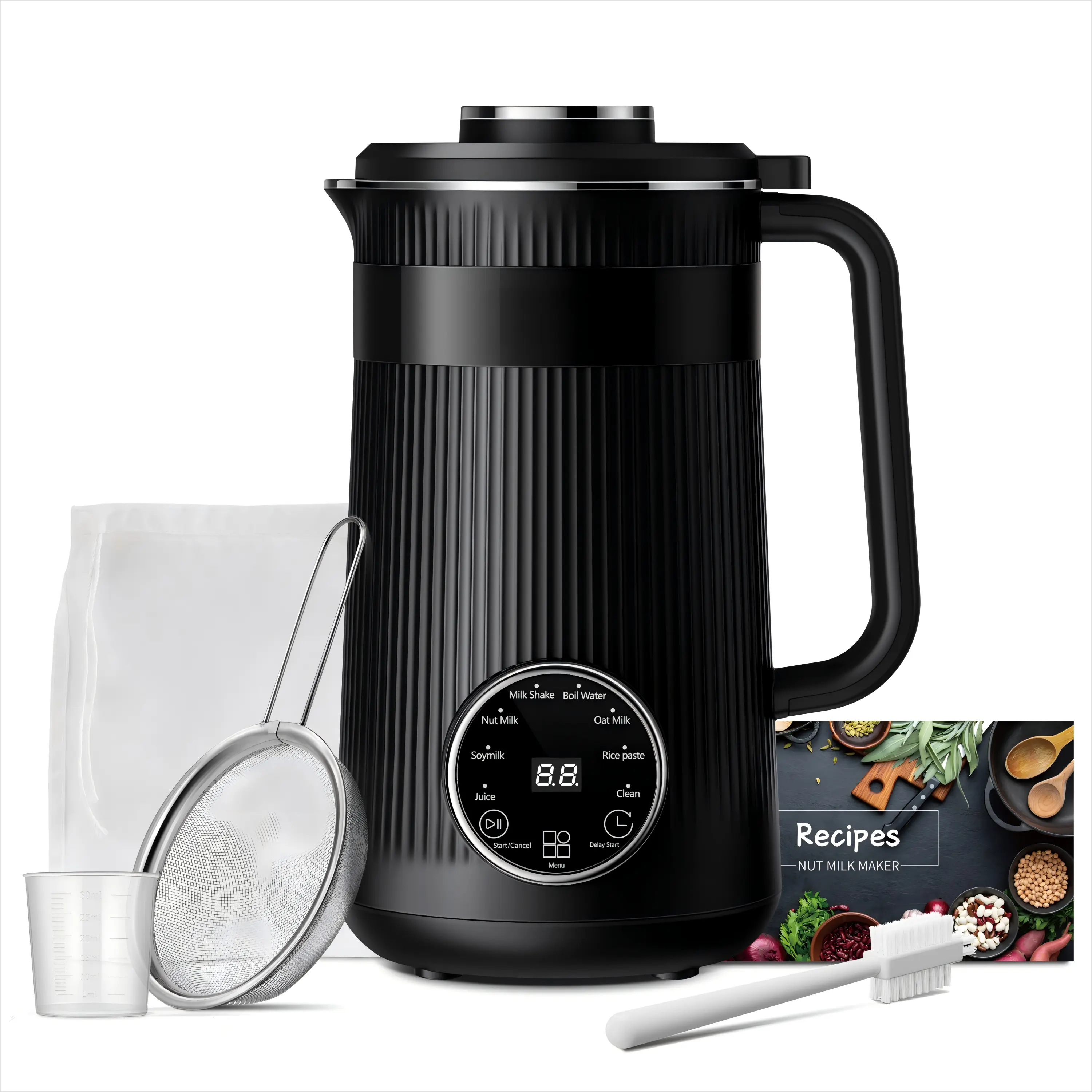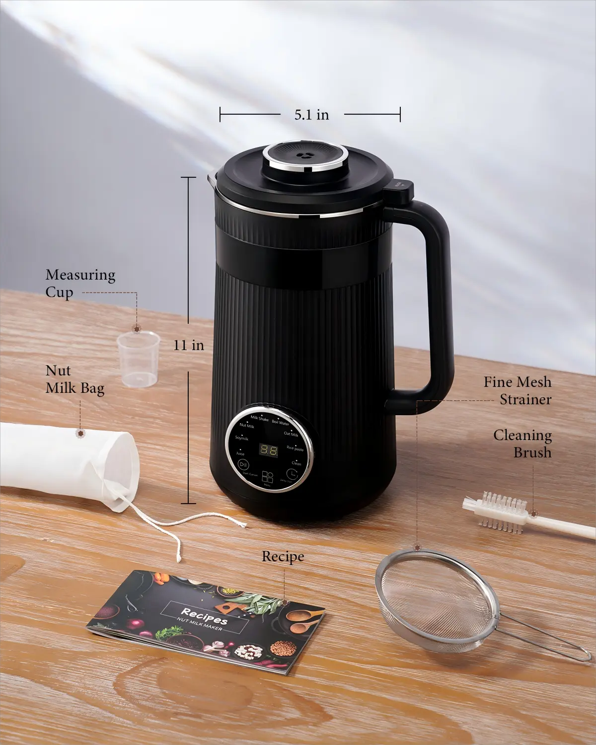 【Comprehensive Accessories】: Your purchase includes a Measuring Cup, Cleaning Brush, Fine Mesh Strainer, Nut Milk Bag, Recipe book, power cable, and warranty card—everything you need for a seamless experience.