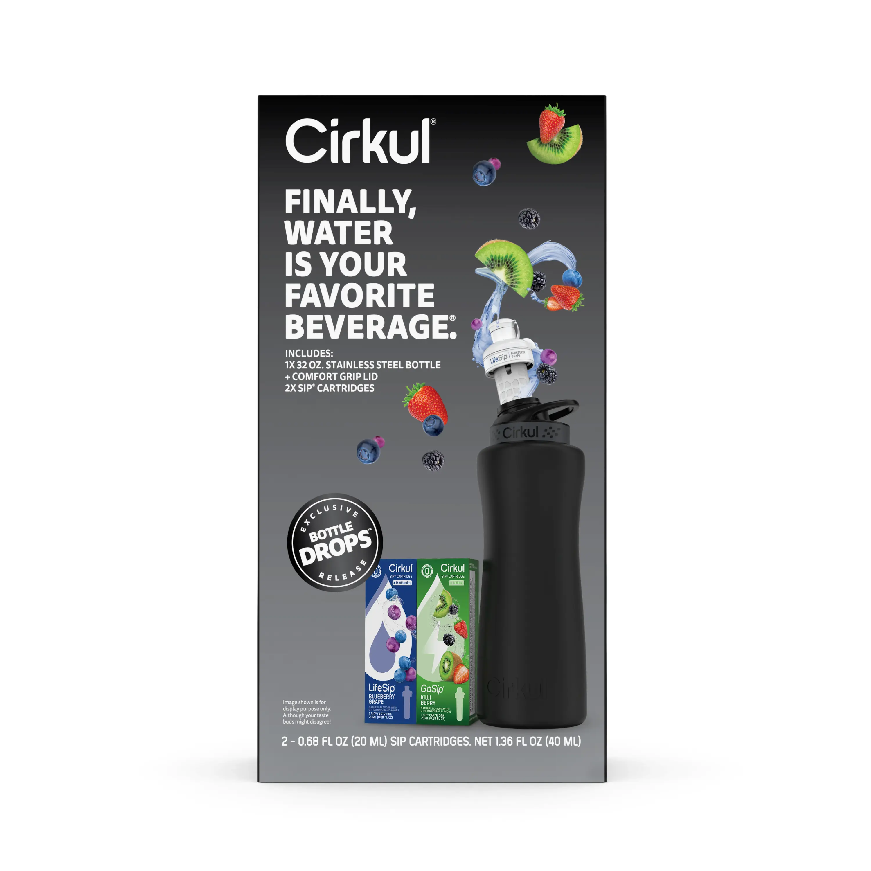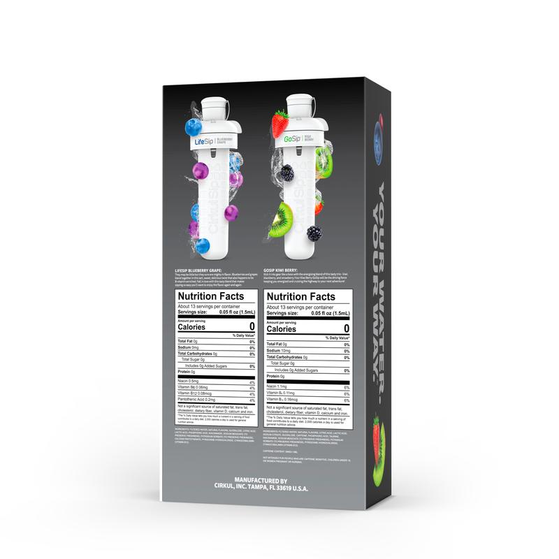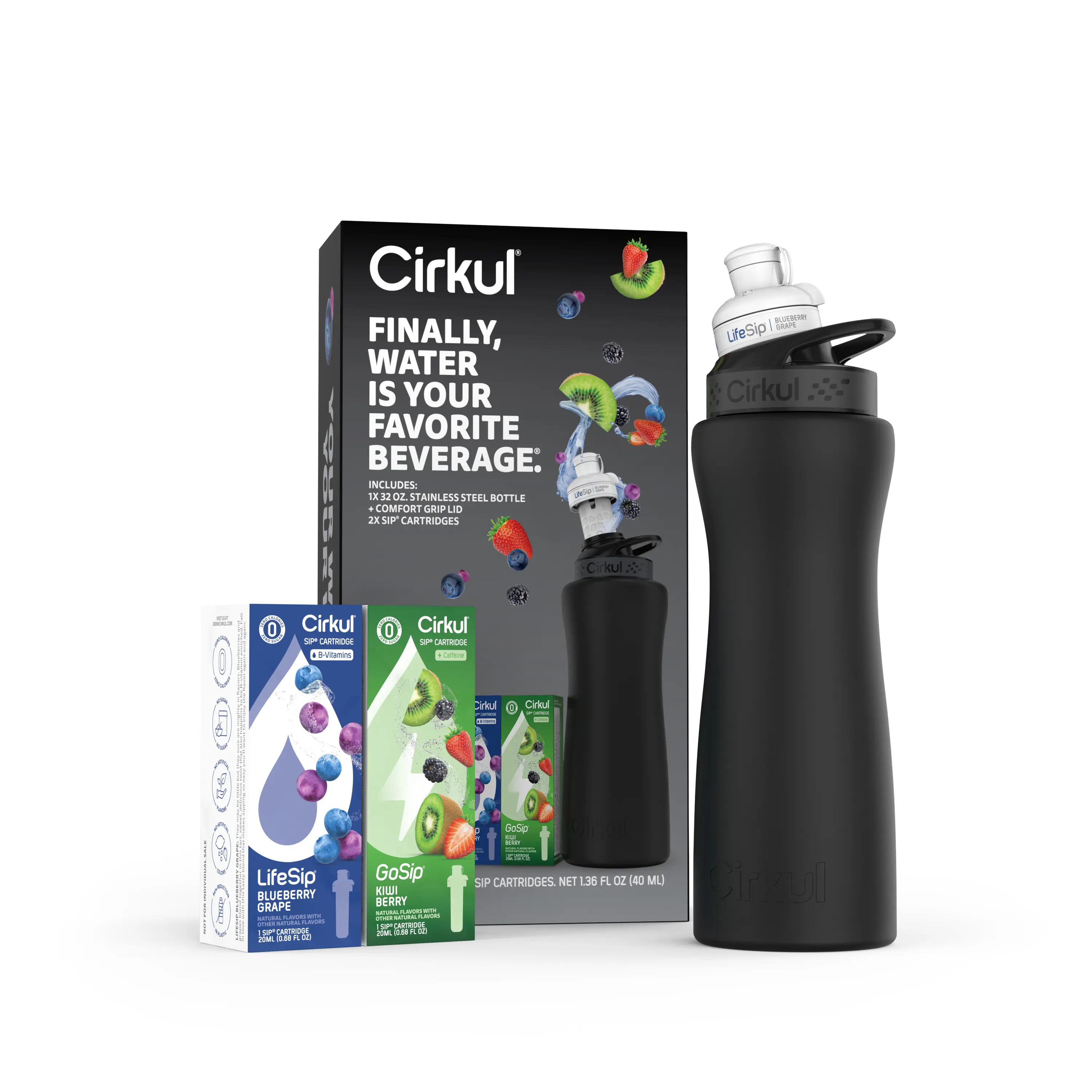 Ready to elevate your water game? This 32oz. Matte Black Stainless Steel Bottle Starter Kit is your perfect introduction to Cirkul. It includes an innovative water bottle and 2 flavor cartridges: LifeSip Blueberry Grape and GoSip Kiwi Berry. No sugar, zero calories, and no artificial colors. Enjoy personalized, delicious hydration!