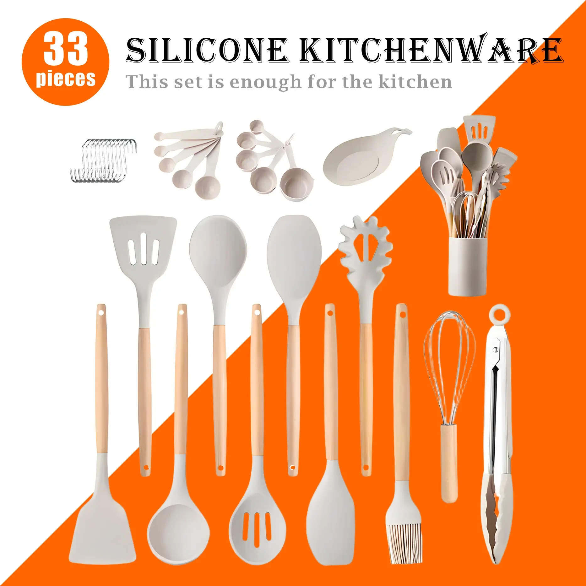 ✨ This set includes everything needed for cooking. It features non-stick silicone utensils with wooden handles. Perfect for flipping, stirring, and serving, it comes with a holder for organization. The set is versatile, suitable for various kitchen tasks. Enjoy hassle-free cooking with this comprehensive utensil set.