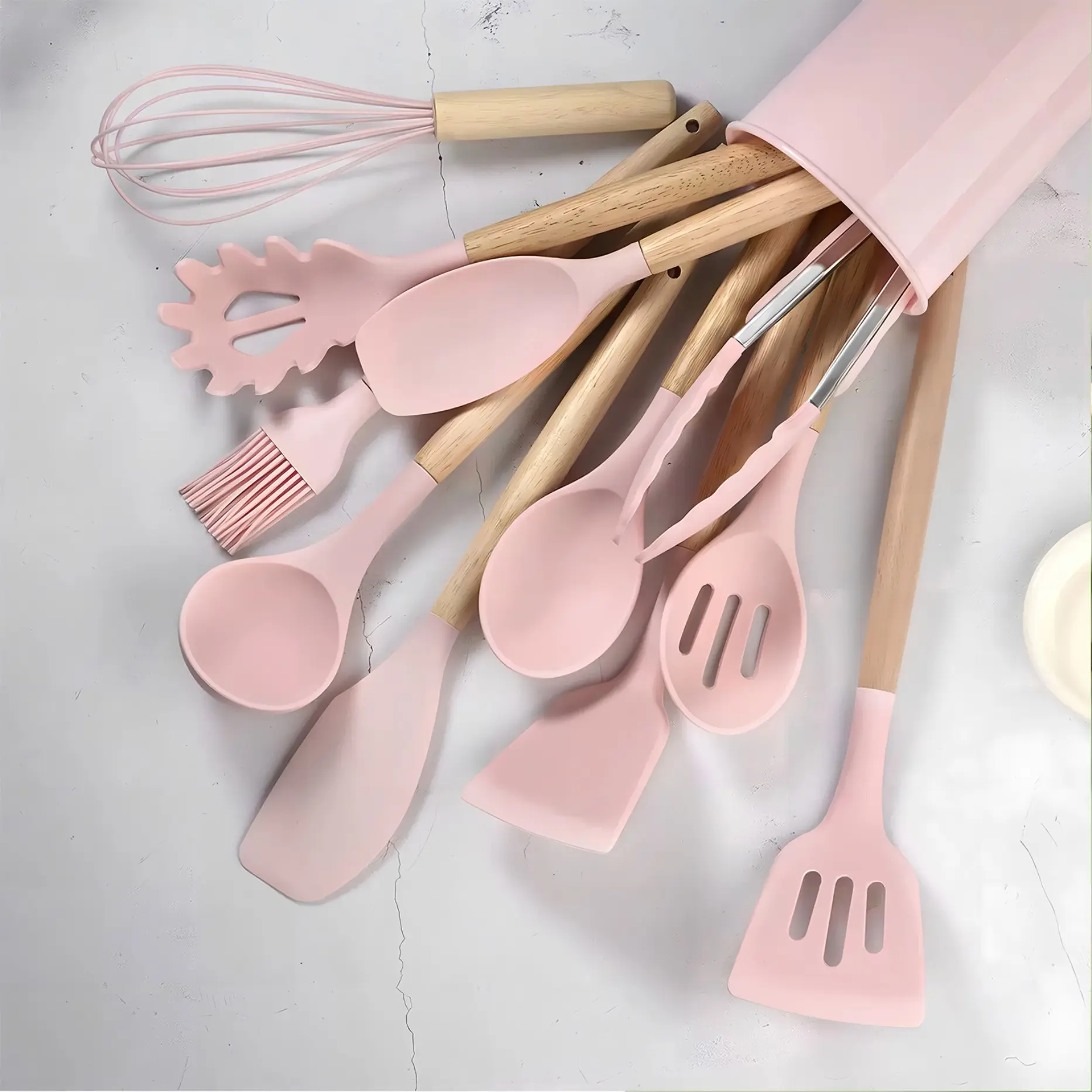 The silicone material is durable and easy to clean. The wooden handles add a touch of elegance. Ideal for both home cooks and professionals, this set enhances your kitchen experience. Enjoy a versatile cooking set that combines functionality with design.
