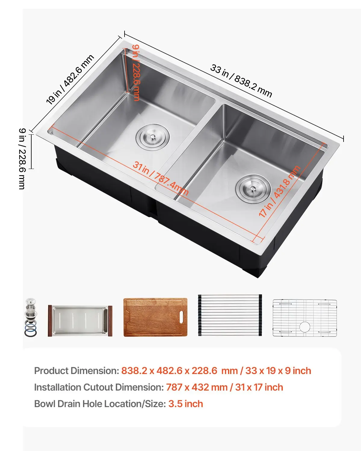 ·Large Capacity: Sink External Dimension: 33x19 inch. Internal Dimension: 31x17 inch. Bowl depth: 9 inch. This kitchen drop-in basin is deep enough to accommodate cups, pots, and baking trays, meeting various washing needs.
