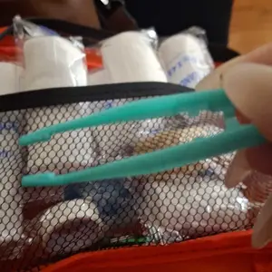 I was expecting this to be a little bigger it's cheaply made the tweezers are plastic how do you even get something out of your hand with tweezers that are plastic safety pins are tiny little safety pins and the photo it shows bigger safety pins it's not what I expected