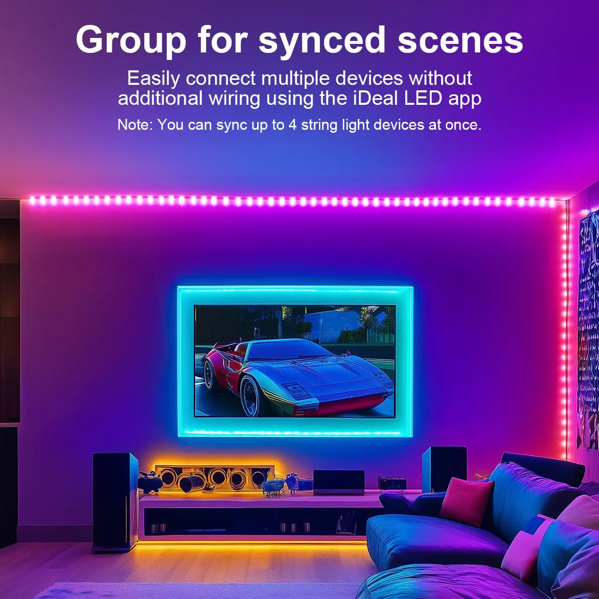 ·【Group Control for Synced Scenes】:You can set up 4 string light devices (with a maximum 10-meter distance between each) to create stunning multi-object decoration layouts. Sync all the lights together to cover up to 40 meters of space, perfect for large-area decor needs. (Note: The group sync mode must be activated through the "iDeal LED" app.).