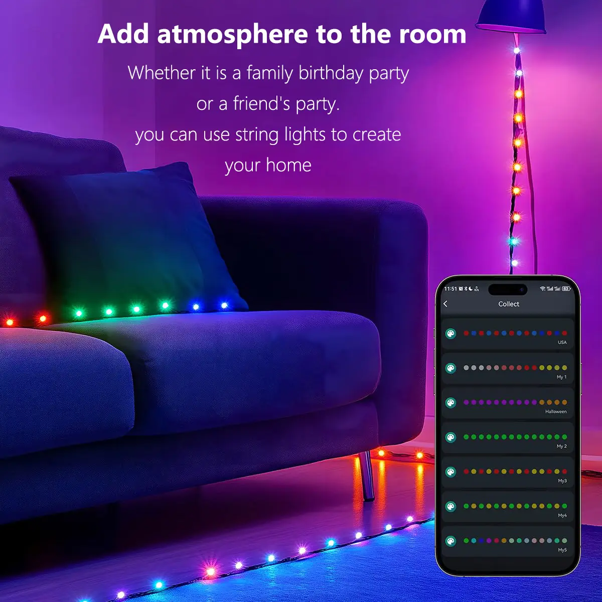 ·【Music and Voice Sync】:Switch to music rhythm mode, and the lights will detect and synchronize with the music rhythm through the built-in microphone, moving in time with the rhythm of the songs played on your phone. Multi-color string lights can also detect and match the music through the microphone, achieving synchronization with the music and transforming your space into a dynamic light show.