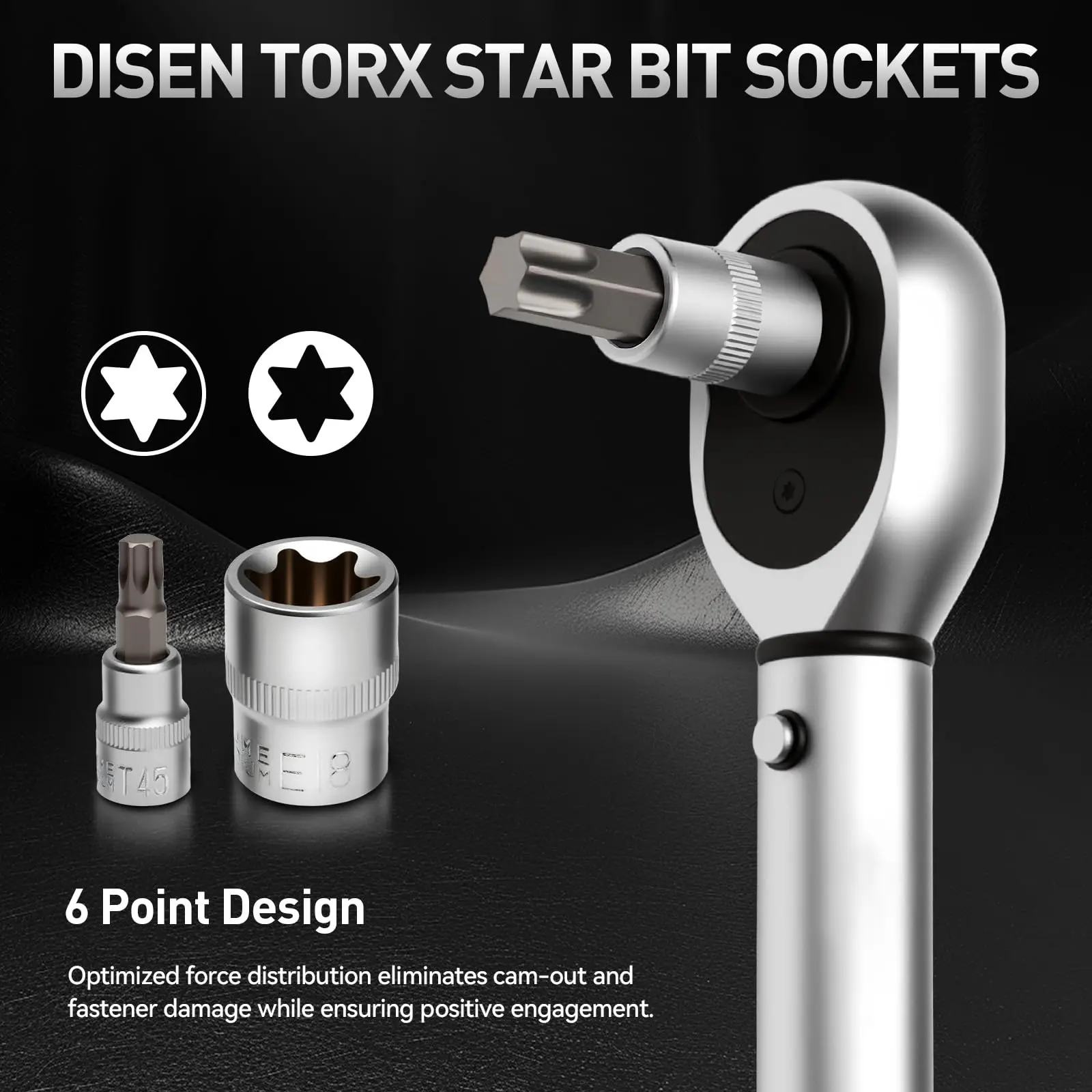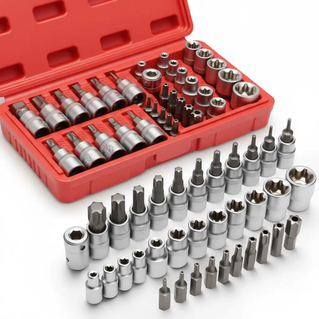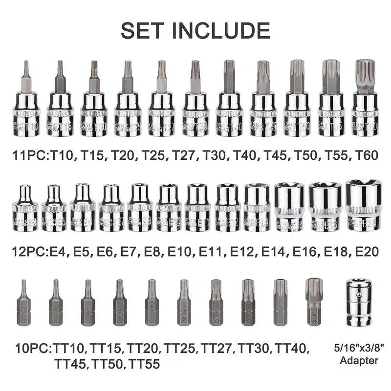 ·Includes 12 E-sockets (E4-E20), 11 Torx bit sockets (T10-T60), 10 star bits (TT10-TT55).