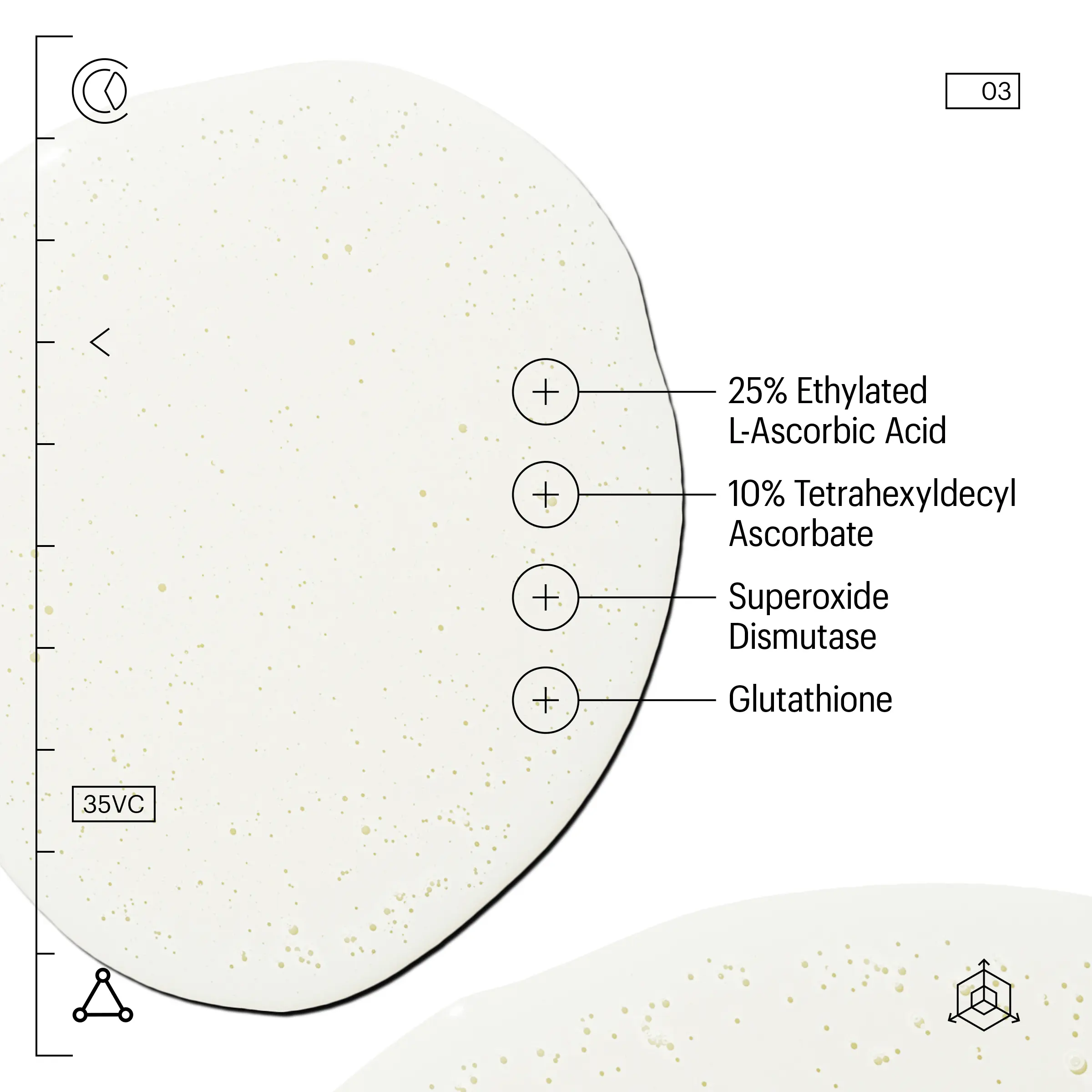 Ingredients25% Ethylated L-Ascorbic Acid Superoxide Dismutase Glutathione Ethoxydiglycol 3-O-Ethyl Ascorbic Acid 10% Tetrahexyldecyl Ascorbate Dimethyl Isosorbide Isodecyl Neopentanoate Ethylhexylglycerin Caprylyl Glycol Phenoxyethanol