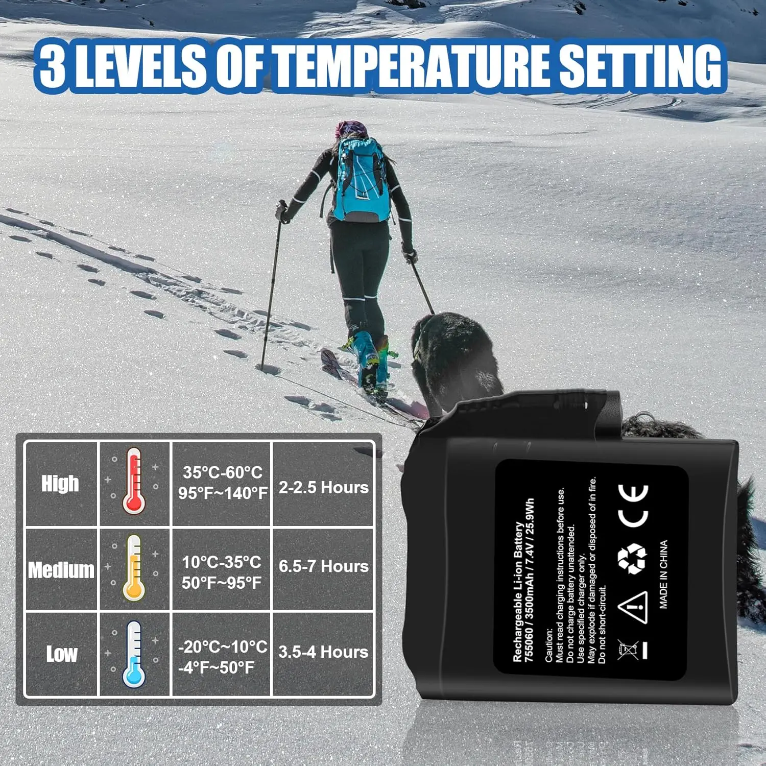 ·Package Includes: 2 x 3500mAh 7.4V Battery for Heated Gloves.