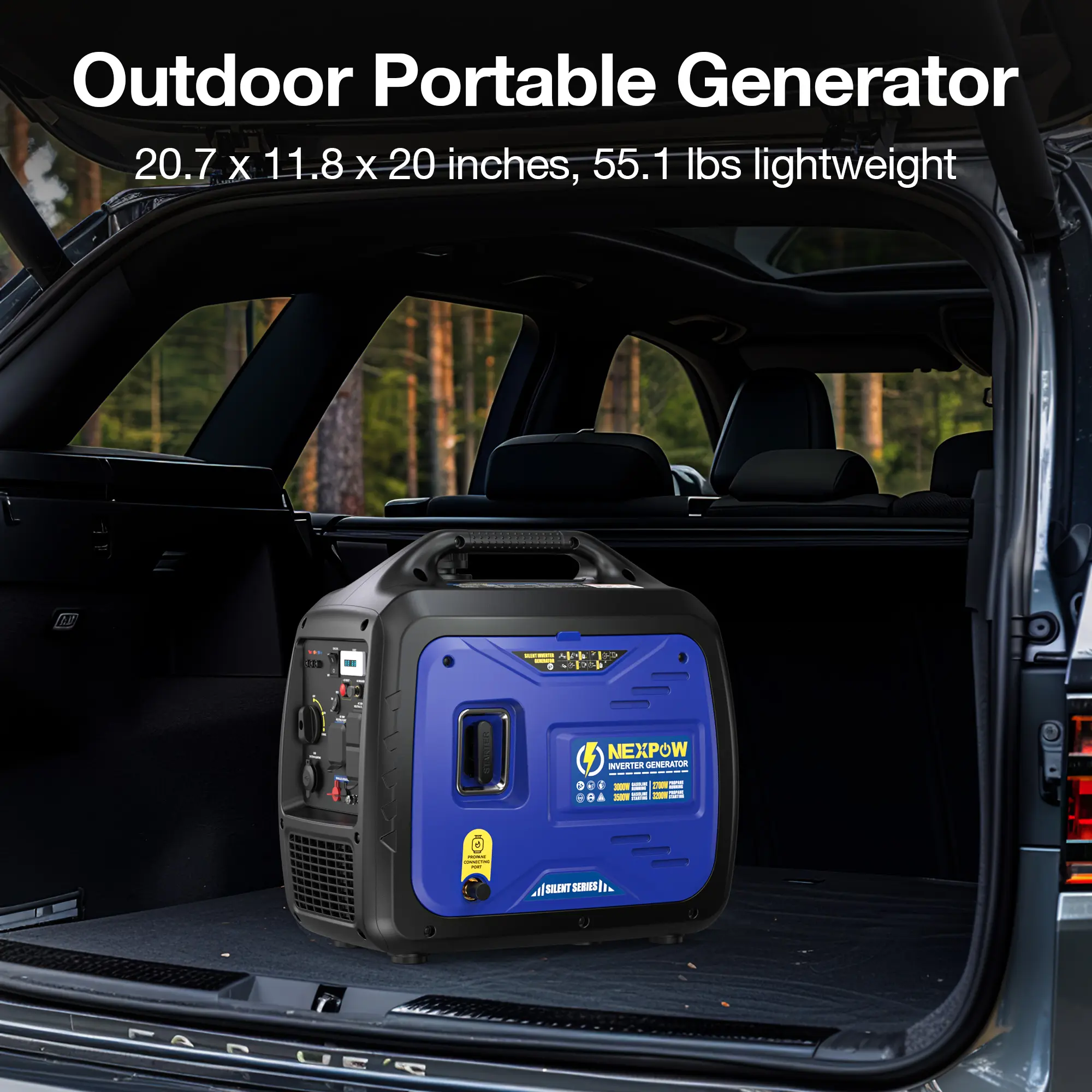 The NEXPOW Portable Inverter Generator is a durable and reliable power solution for both household and outdoor needs. This dual-fuel generator delivers flexible energy options with gasoline (3,000 running watts / 3,500 peak watts) and propane (2,700 running watts / 3,200 peak watts). Equipped with multiple outlets including a 120V L5-30R 30A socket, 120V 5-20R duplex outlet, USB (5V/3.6A), Type-C (5V/3.6A) port, it ensures safe simultaneous connections for various devices.Featuring parallel connectivity to double power output, this EPA-certified generator operates safely while its Eco Mode optimizes fuel efficiency, extending runtime to over 10 hours at 25% load. With minimal noise emission (58 dB at 23 feet) and premium copper wiring for enhanced conductivity, it houses a robust 154cc 4-stroke OHV single-cylinder engine. Weighing only 55.1 lbs with a reinforced handle, its portable design makes it ideal for home backup and outdoor adventures, ensuring power accessibility wherever you go.