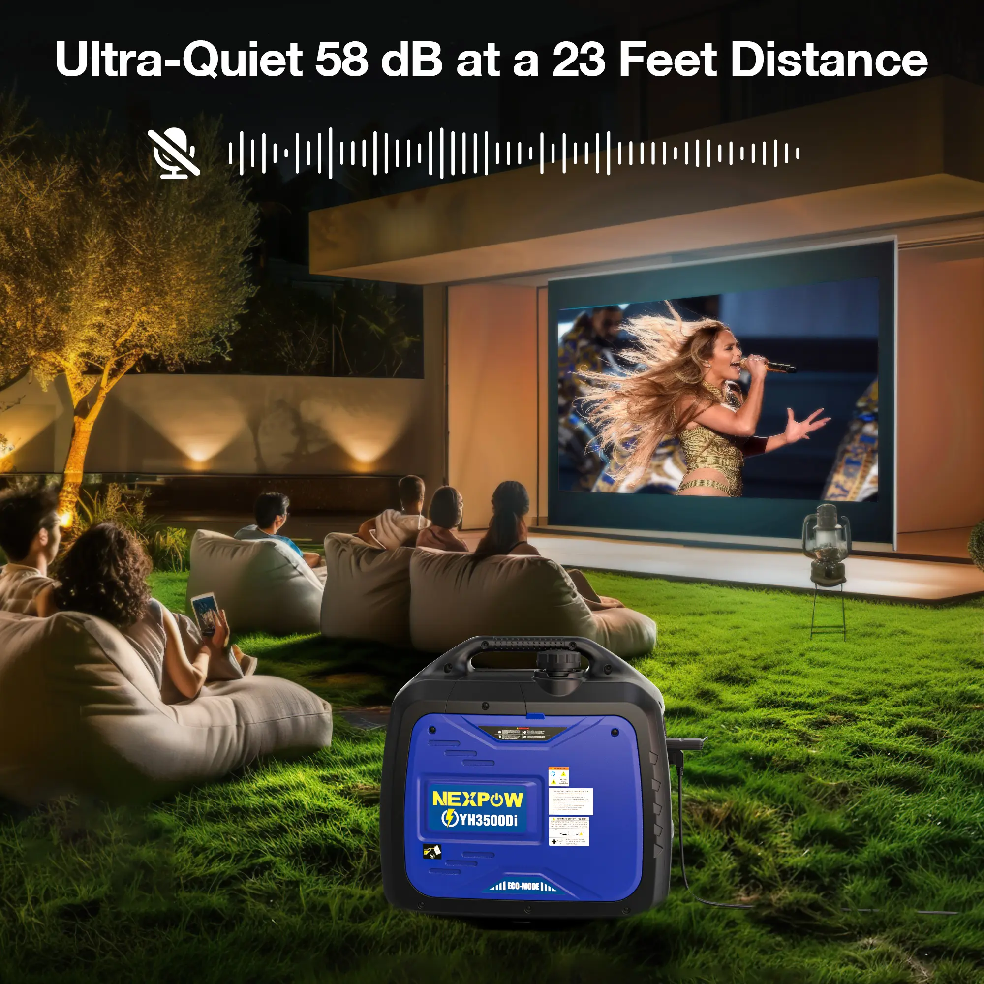 ·【Ultra-Quiet Mode】Incorporating an advanced muffler and fully enclosed design, this technology significantly reduces operational noise. Compared to traditional generators, the NEXPOW YH3500Di engine operates in Ultra-Quiet Mode, generating merely 58 dB of noise at 23 feet distance in ECO mode. This noise level is comparable to normal conversation or dishwasher operation, ensuring minimal disturbance to users or nearby individuals.