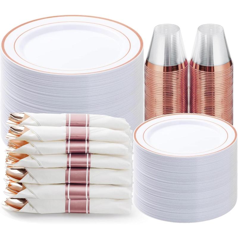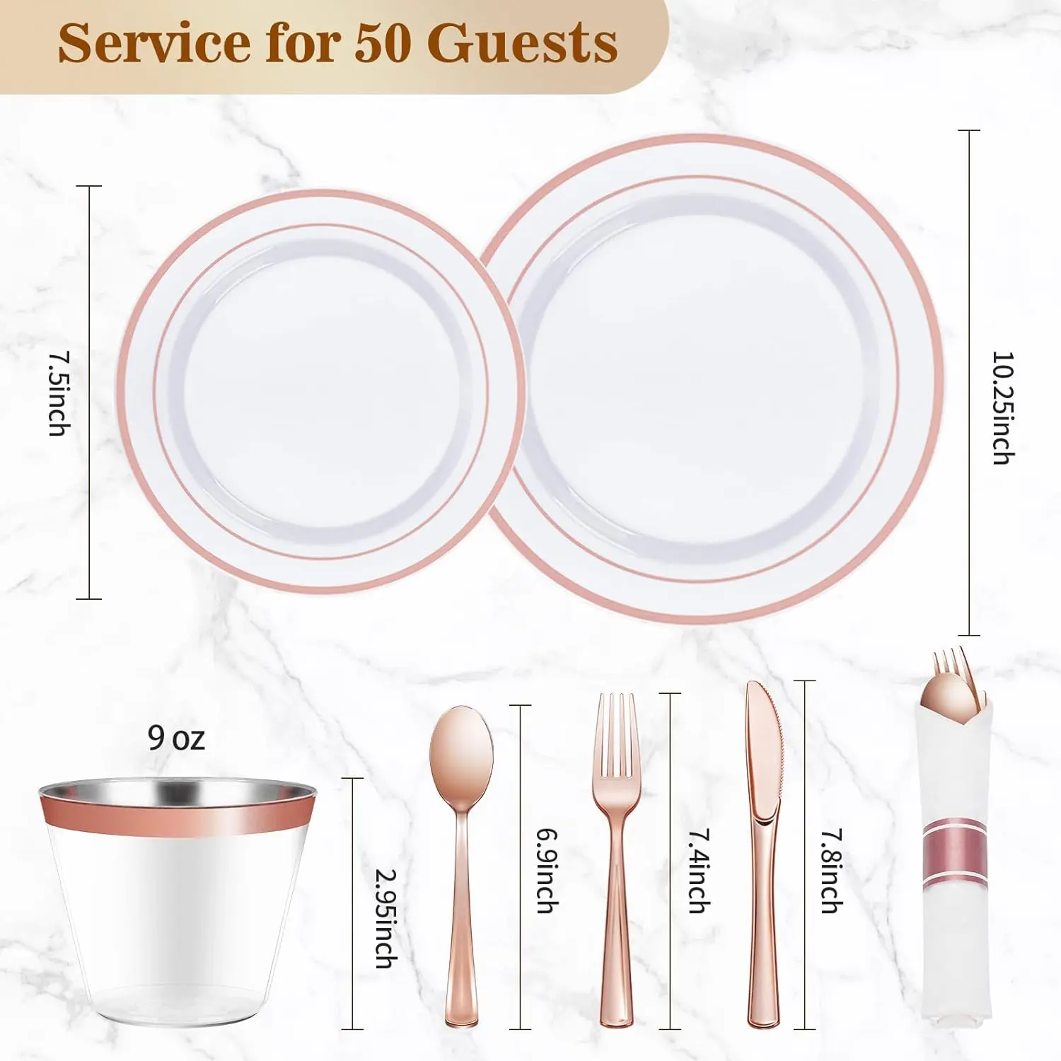 This exceptional party plate set is thoughtfully designed to suit all occasions. Each package includes 50 dinner plates (10.25"), 50 salad plates (7.5"), 50 sets of rose gold silverware with pre-rolled napkins, and 50 9oz cups—everything you need for a seamless event.