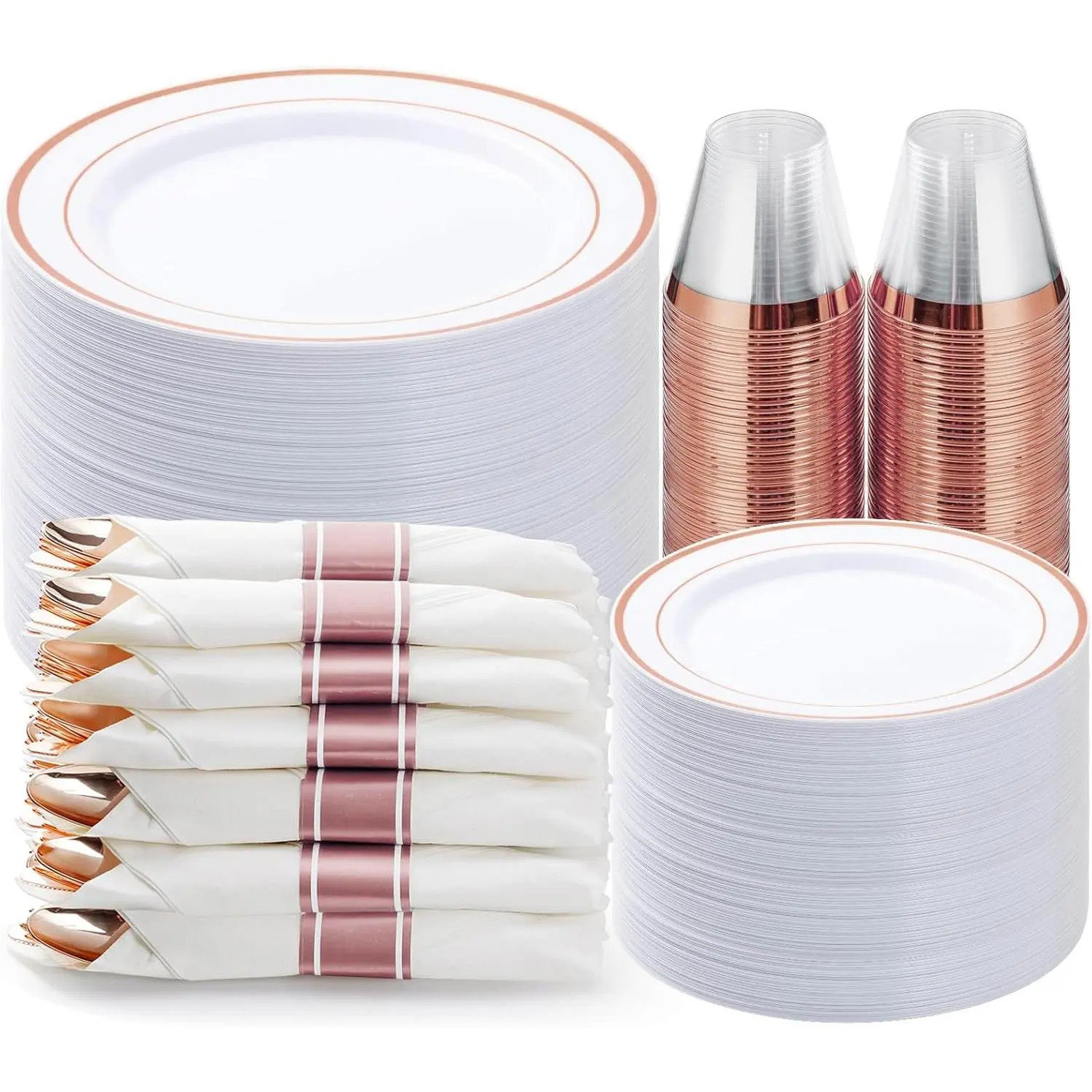 The elegant rose gold design makes this set perfect for a variety of events, including weddings, anniversaries, birthdays, and bachelorette parties. The timeless color scheme adds sophistication to any gathering, while the disposable nature of the set ensures minimal cleanup, saving valuable time for party planners and hosts alike.