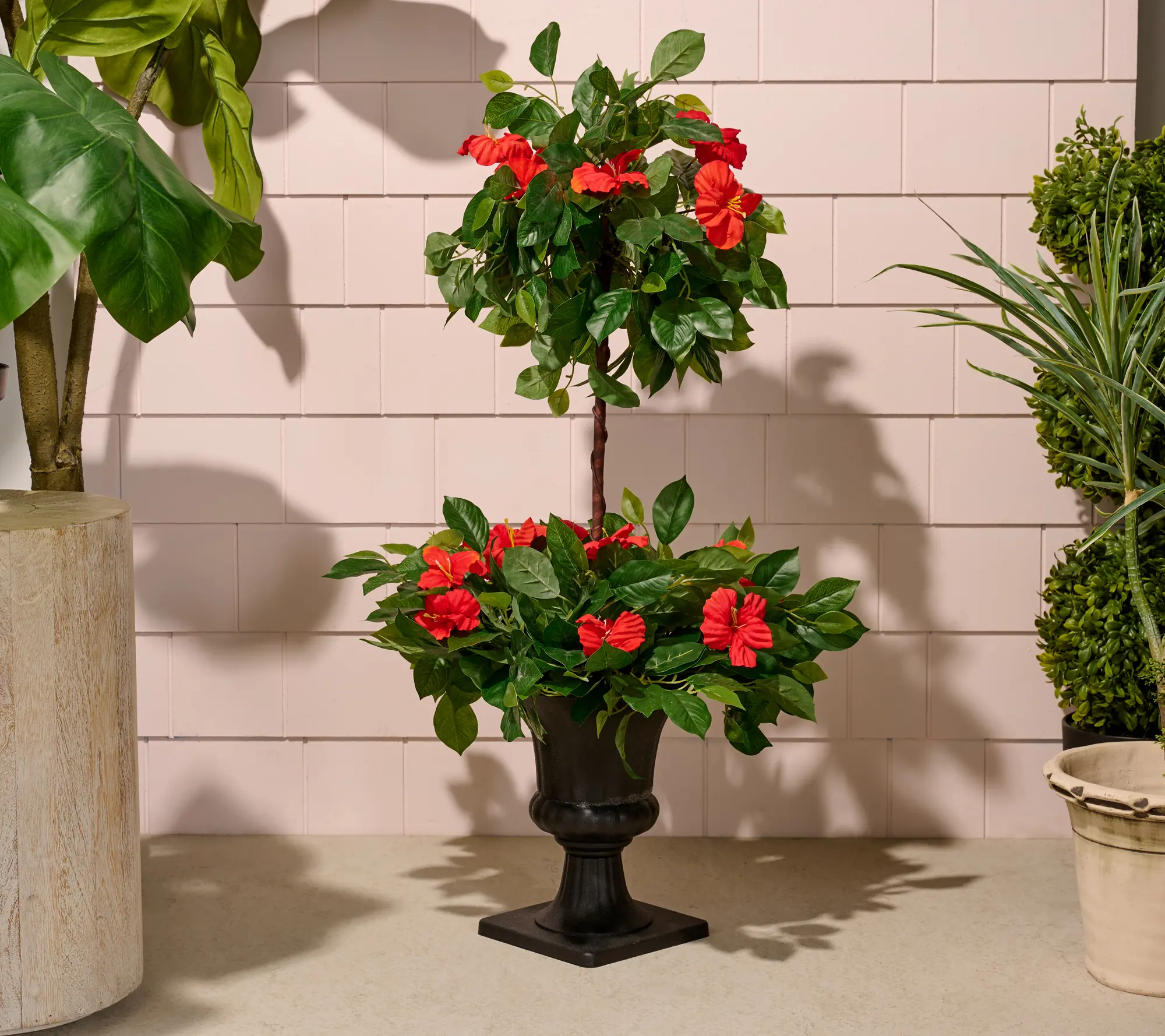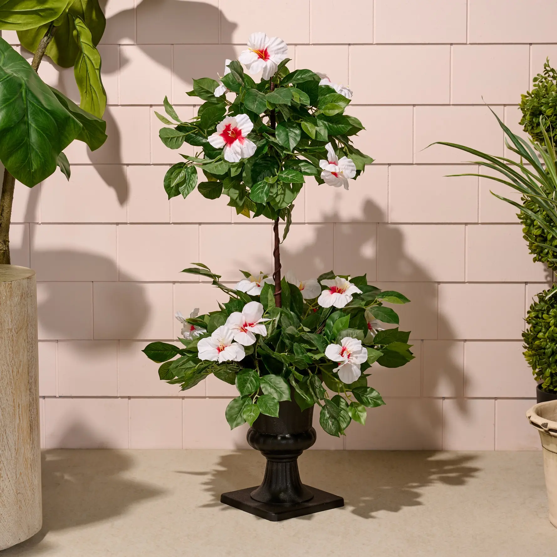 ·Includes two-tier faux hibiscus topiary in pot