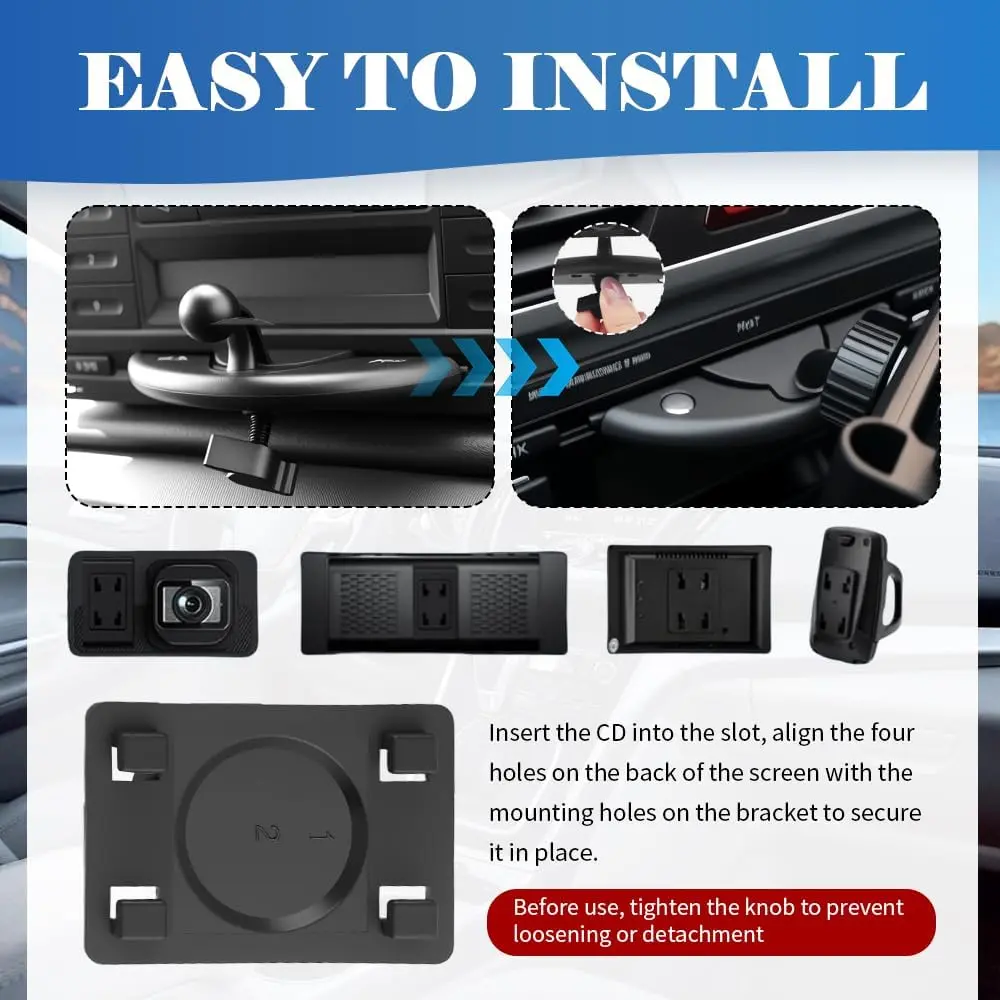 ·Easy to Install: Insert our CD slot mount directly into the CD slot, align the four holes at back of screen with CD slot mount and mount it to use it, can be mounted upward and downward, note that tighten the knobs before using it so that it will not loose and fall off