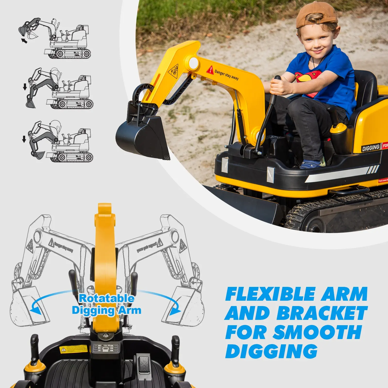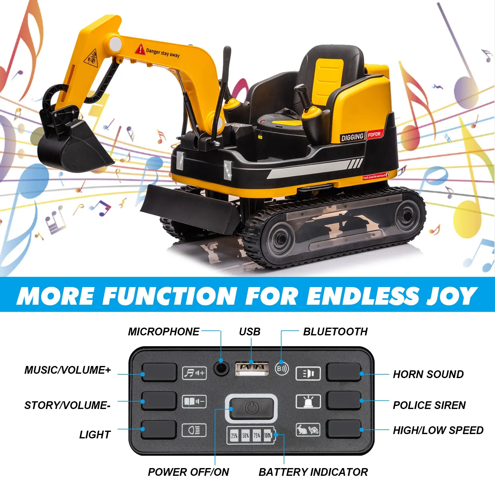 This ride-on toy comes with an MP3 feature, adding a modern twist to traditional play. Kids can listen to their favorite music while operating the excavator and bulldozer. The remote control ensures easy operation, making it a fun and engaging experience for children. It's a great way for kids to enjoy music and construction play simultaneously.