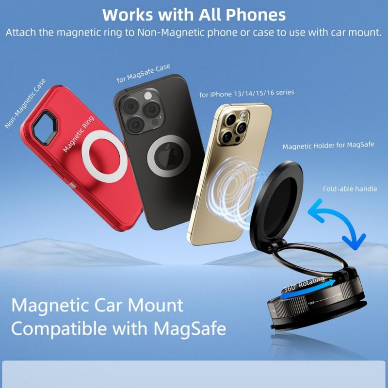 Universal Compatibility: This suction cup magnetic phone holder is designed specifically for iPhone models 16, 15, 14, 13, 12, as well as all devices compatible with MagSafe technology. For non-magnetic phones and cases, we offer a metal ring that fits all smartphones. Just stick this metal ring onto the back of your device or case. Then, let it stay in place without being touched for 24 hours to get the maximum adhesive strength