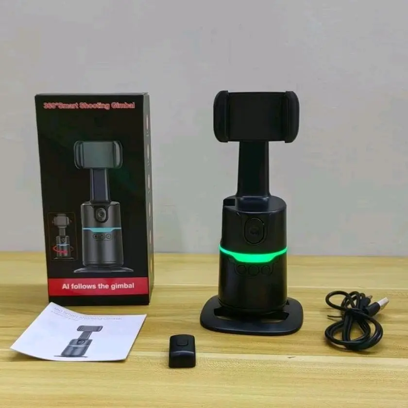 360-degree rotatable smart selfie stick with rechargeable stabilizer and wireless remote for video recording.