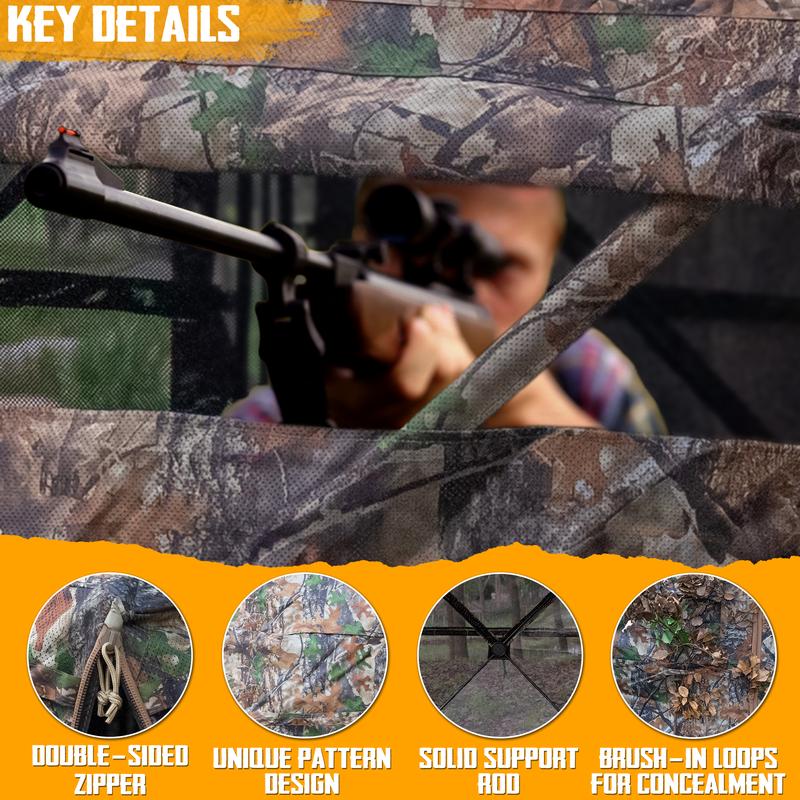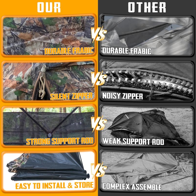 ·🌿 360° See-Through Camo Blind – Watch your surroundings with no blind spots. Silent zipper for entry/exit + realistic camo pattern = stay hidden & completely undetected by deer or turkey.