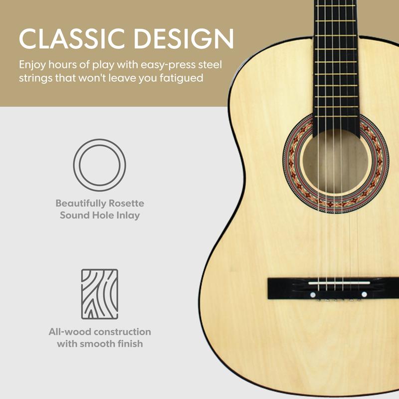 Featuring an all-wood construction with 19 frets and steel strings, this guitar delivers a clear and bright sound. The sleek, smooth finish with classic floral ornamentation around the sound hole for a stylish aesthetic.