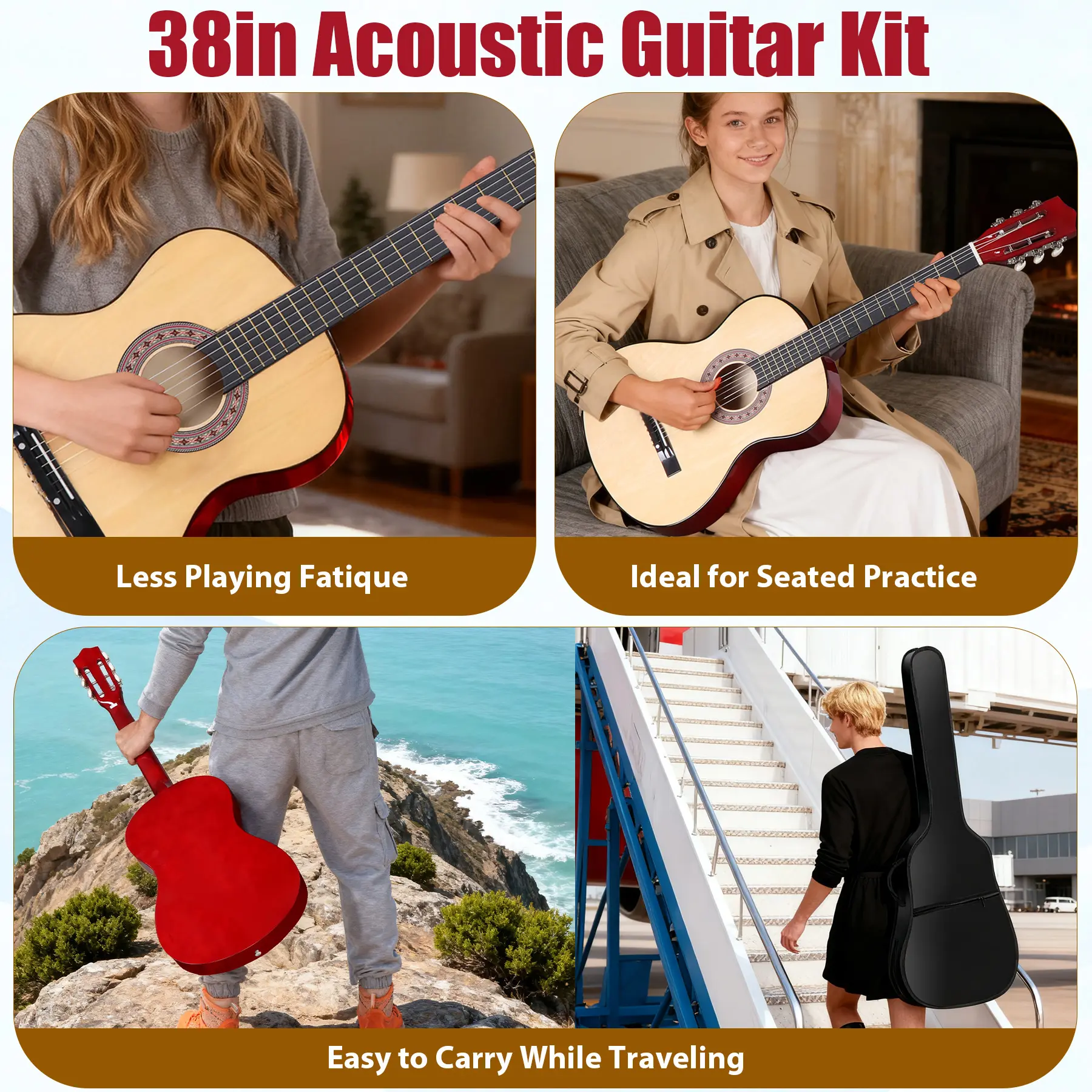 Designed for beginners, this 38" acoustic features a classic shape, smaller size and lighter weight for improved comfort and handling, ideal for those with smaller hands or new to guitar playing.