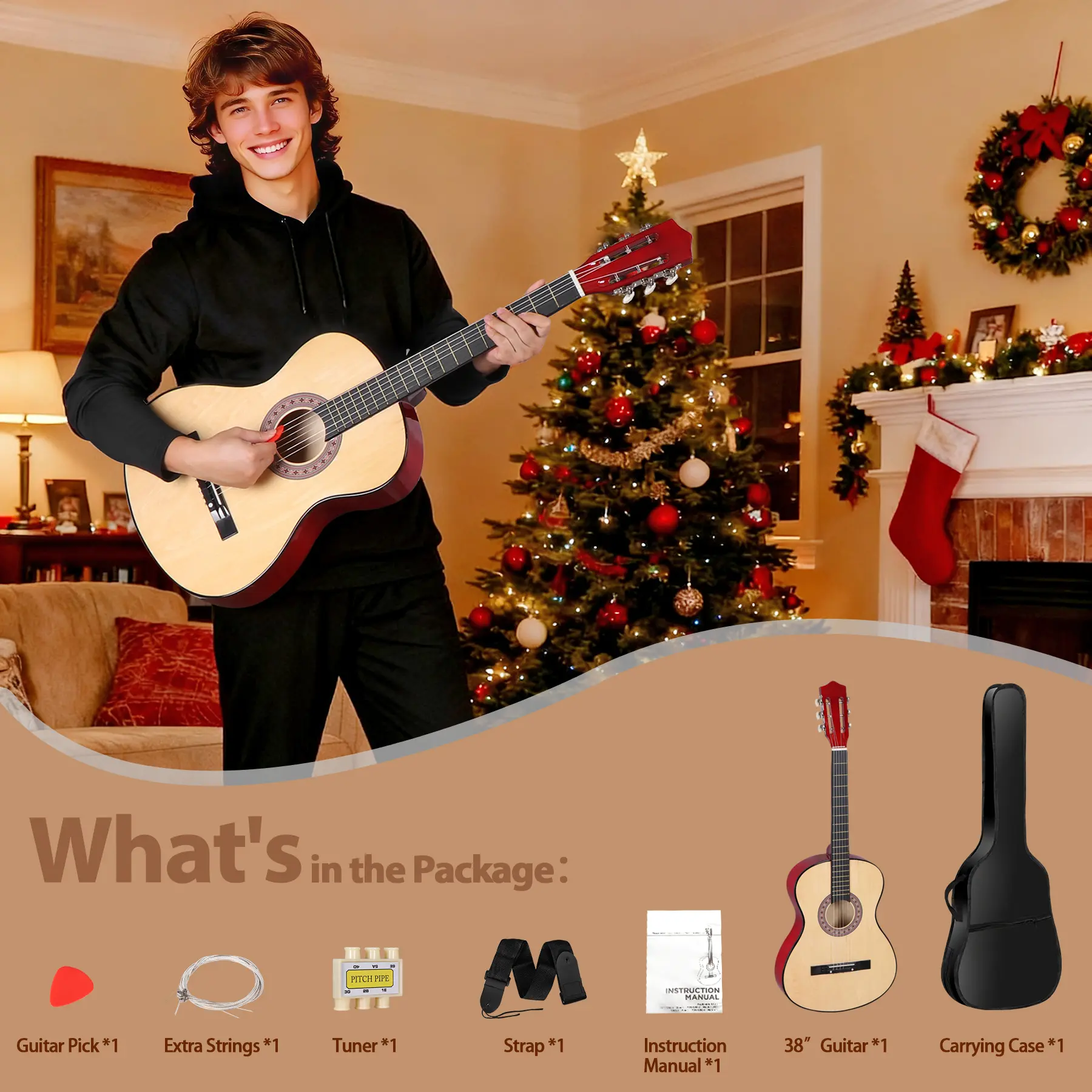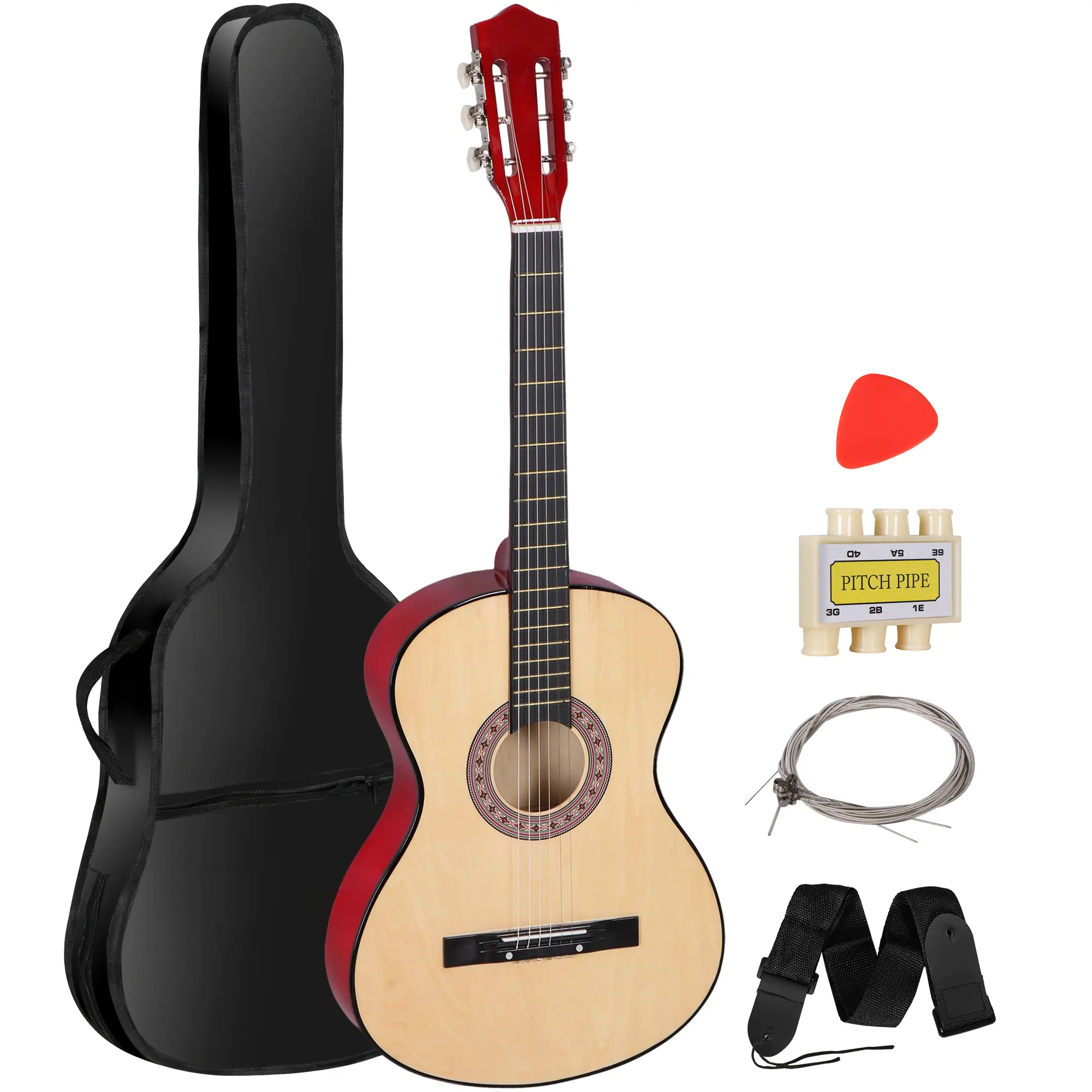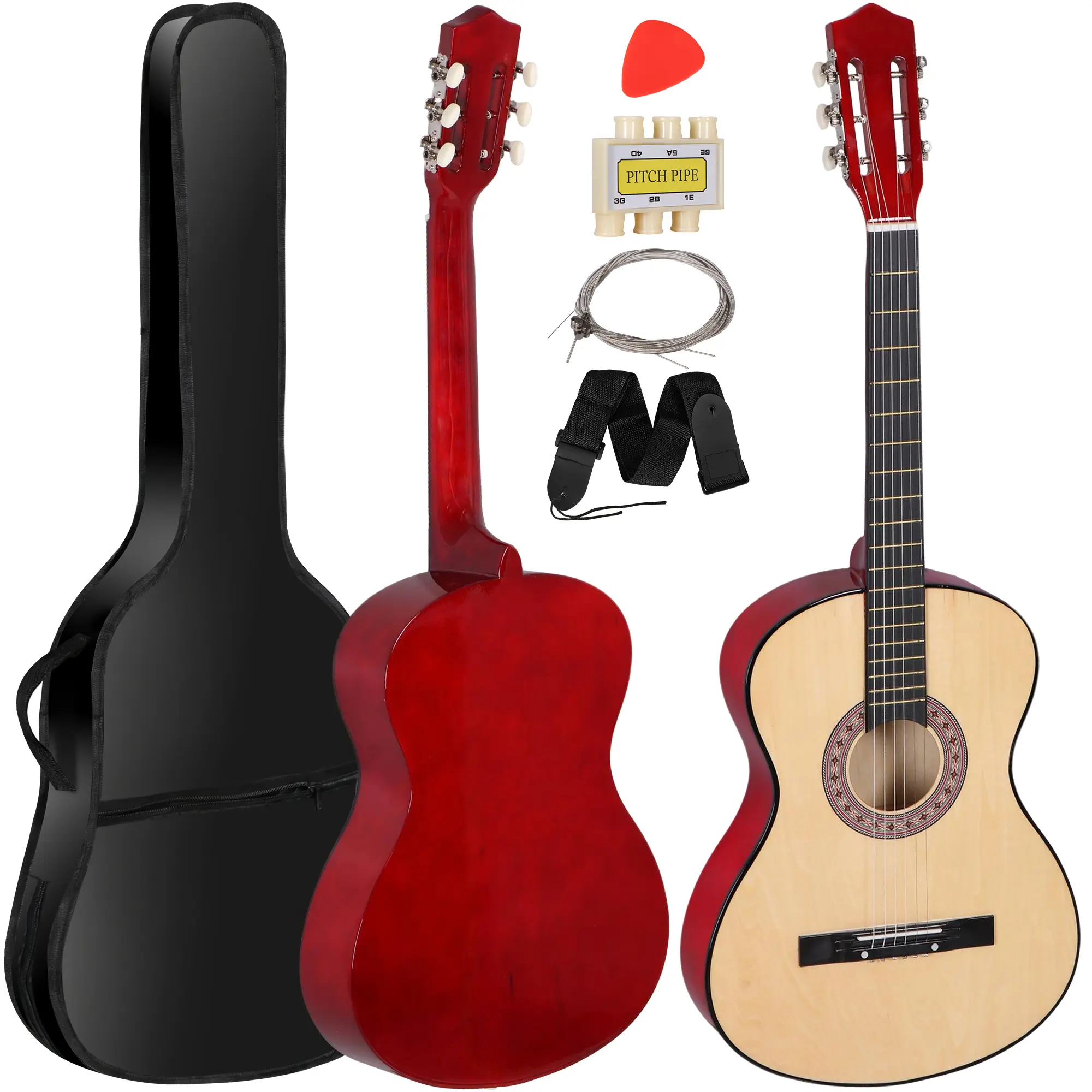 This guitar starter kit includes a carrying case, guitar pick, pitch pipe, shoulder strap and extra set of replacement strings, plus an instruction sheet.