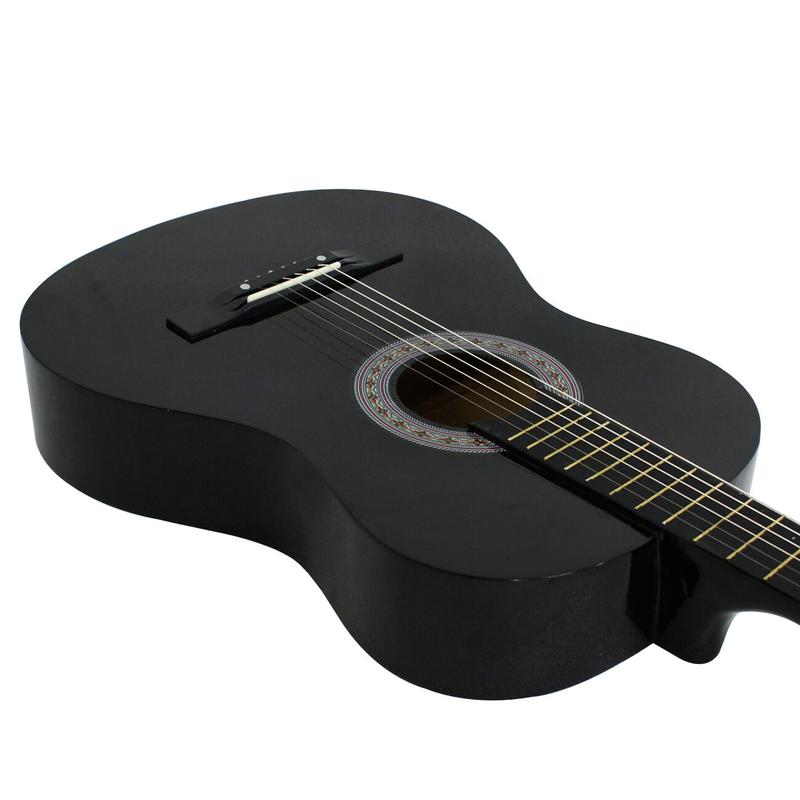 Featuring an all-wood construction with 19 frets and steel strings, this guitar delivers a clear and bright sound. The sleek, smooth finish with classic floral ornamentation around the sound hole for a stylish aesthetic.