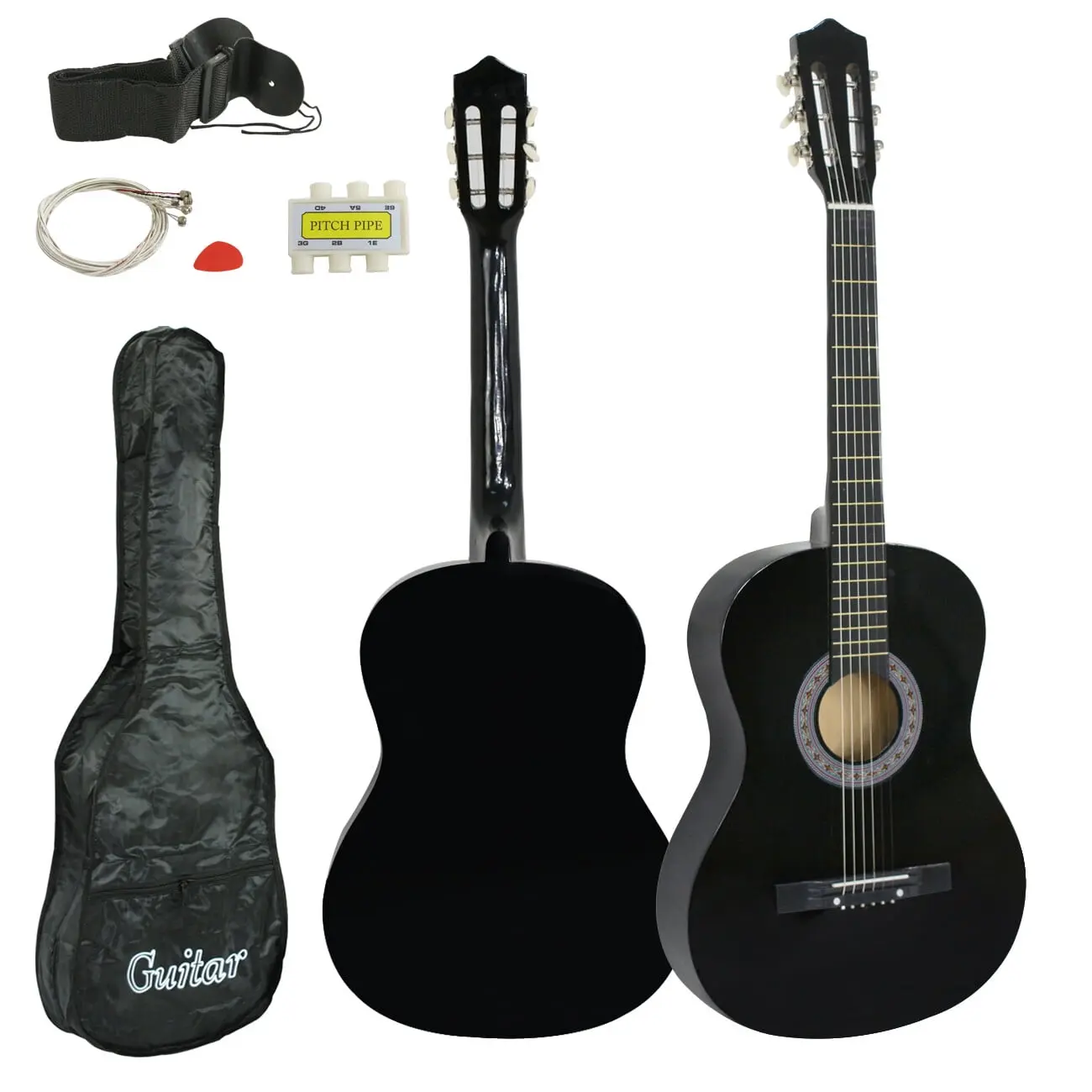 This guitar starter kit includes a carrying case, guitar pick, pitch pipe, shoulder strap and extra set of replacement strings, plus an instruction sheet.
