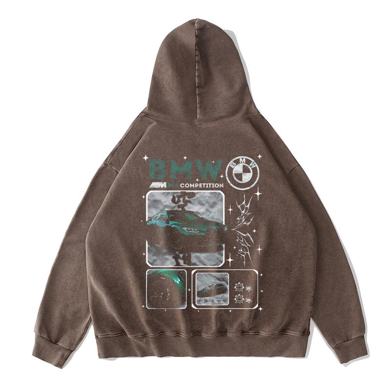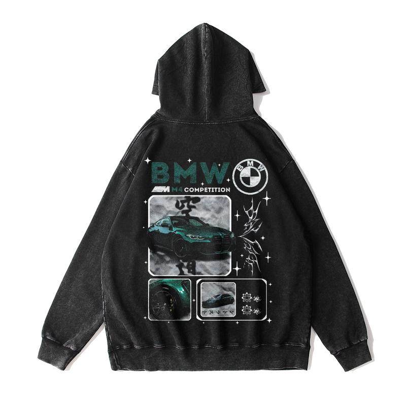 5. 380g Autumn & Winter M4 B M W Cars Washed Hoodie - Basic Style Retro Street Fashion Printed Pullover Sweatshirt