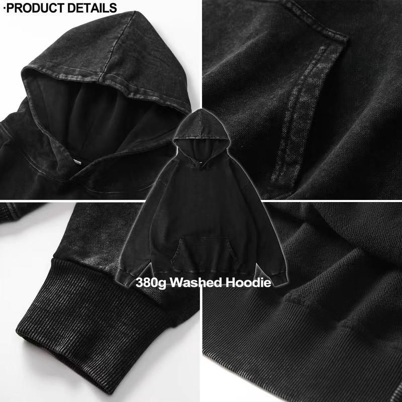 This 380g washed vintage hoodie boasts cozy comfort and ideal thickness. Perfect for late autumn and early winter, it wards off coolness without bulk. Soft to touch, it stays practical for daily wear—your warm go-to piece.