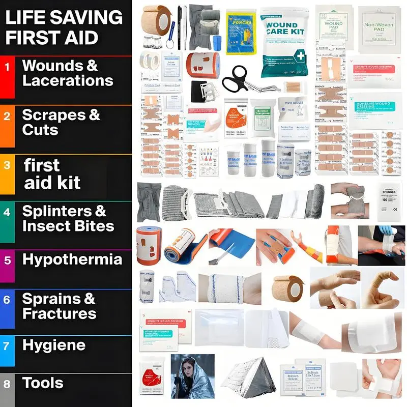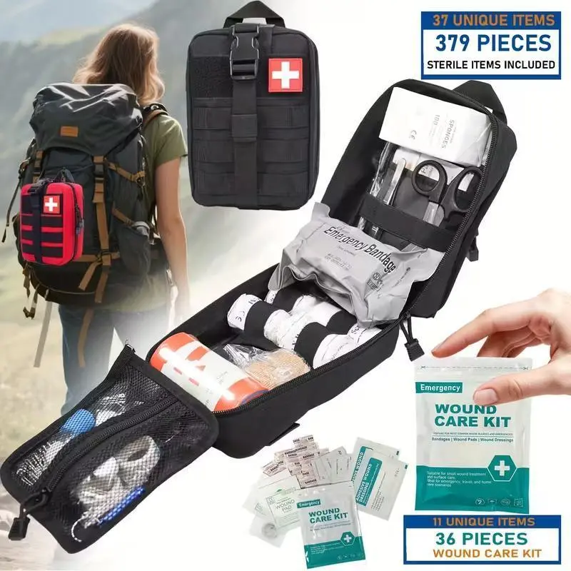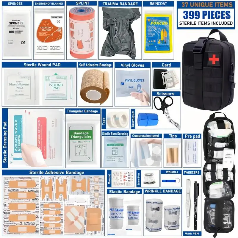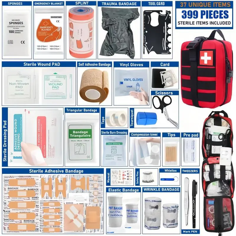 Comprehensive Emergency Medical Kit This professional-grade first aid kit contains 399 unique items, perfect for outdoor survival. Ideal for hiking, camping, hunting, car, boat, travel, and exploration. The kit includes scissors, tweezers, splint, band-aid, whistle, and more. Key Features 33 Unique Items: Offers a comprehensive range of tools for emergency situations. Versatile Use: Suitable for various outdoor activities and travel needs. Perfect Gift: An ideal gift for anyone who loves outdoor adventures. Suitable for Hiking Camping Hunting Car trips Boat rides Travel Exploration ️ Reliable Emergency Kit The kit includes scissors, tweezers, splint, band-aid, whistle, and more. It is designed for professional-grade first aid and outdoor survival. Perfect for anyone who needs a reliable emergency medical kit. ️