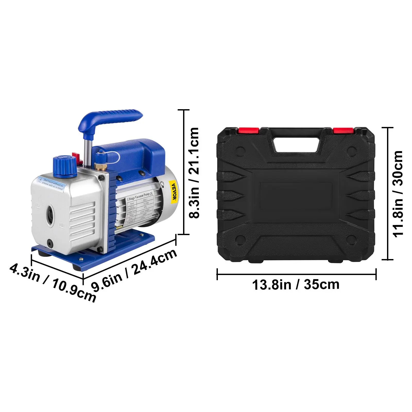 • 3CFM High-Quality Vacuum Pump: This 1/4HP single-stage vacuum pump gives you an ultimate vacuum at 5Pa. The pump has a die-cast aluminum housing which made it lightweight and durable, the composite rubber base gives you a quiet working environment and its built-in thermal protection will protect itself from burning out when something is stuck.