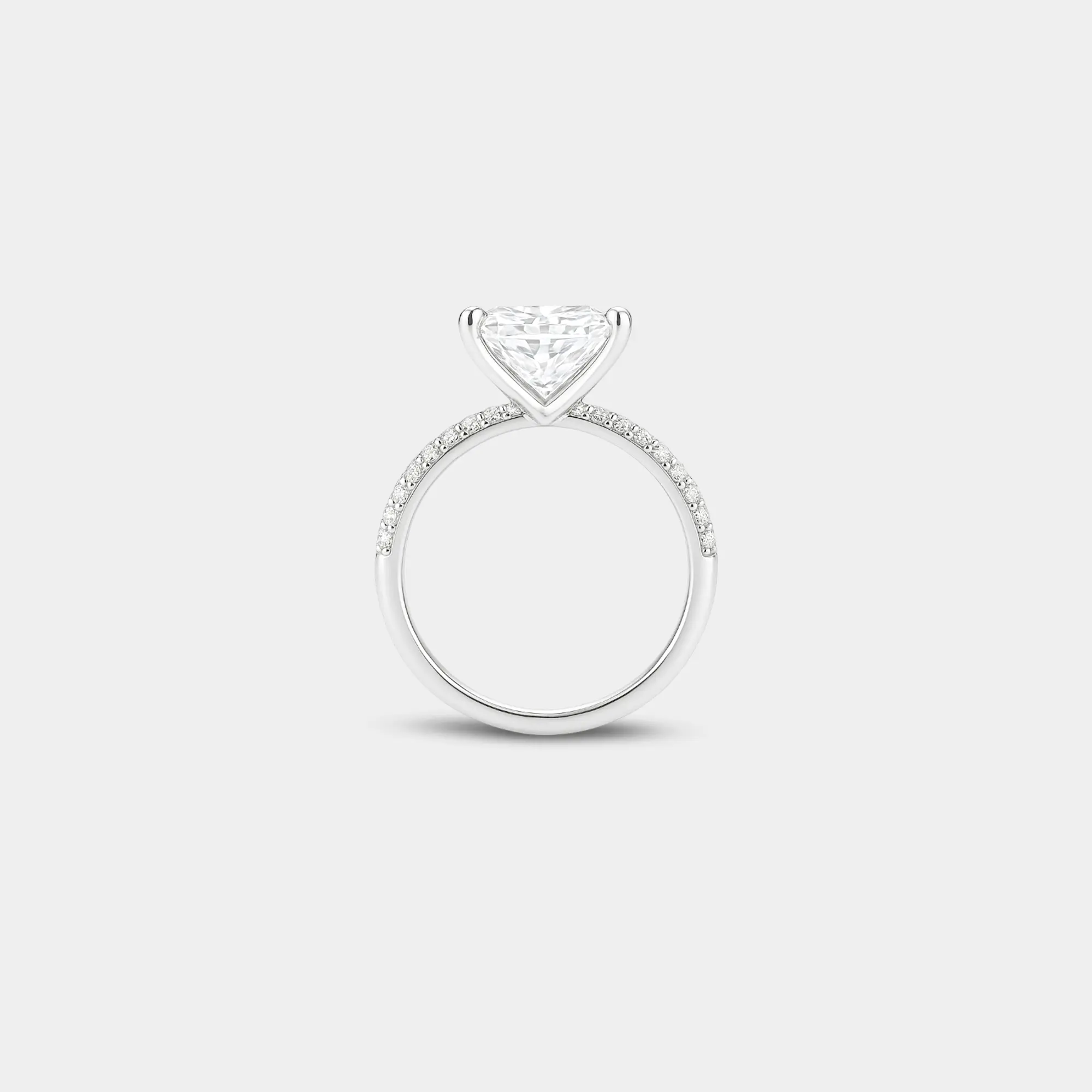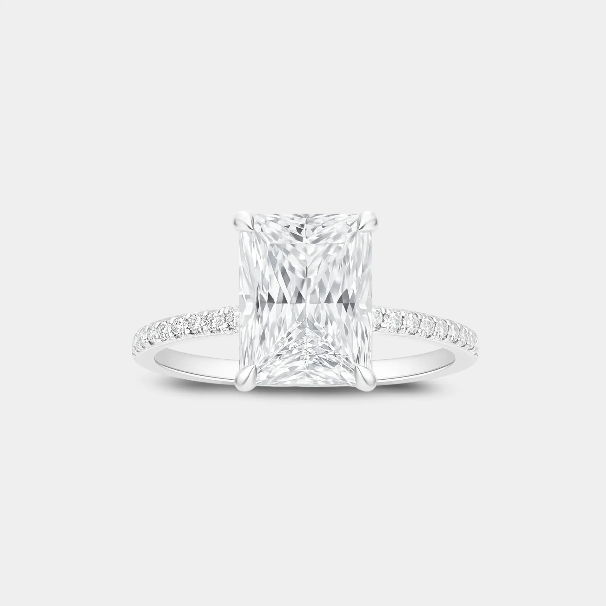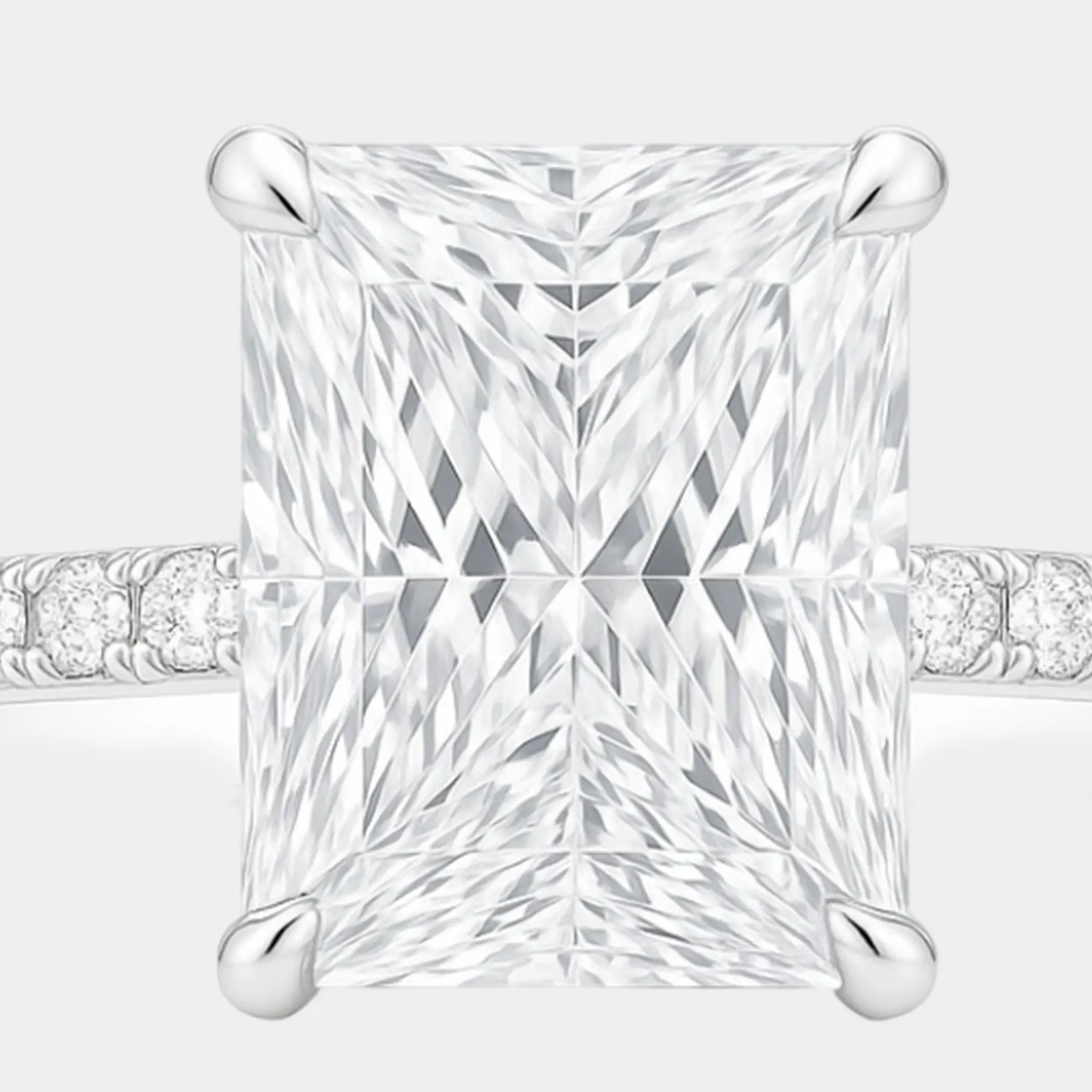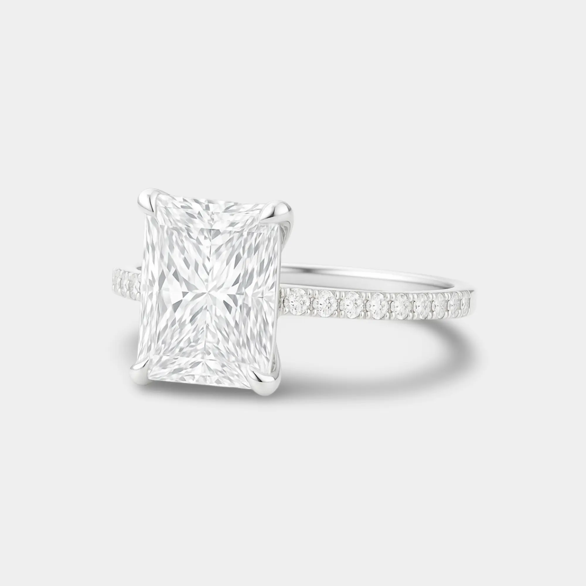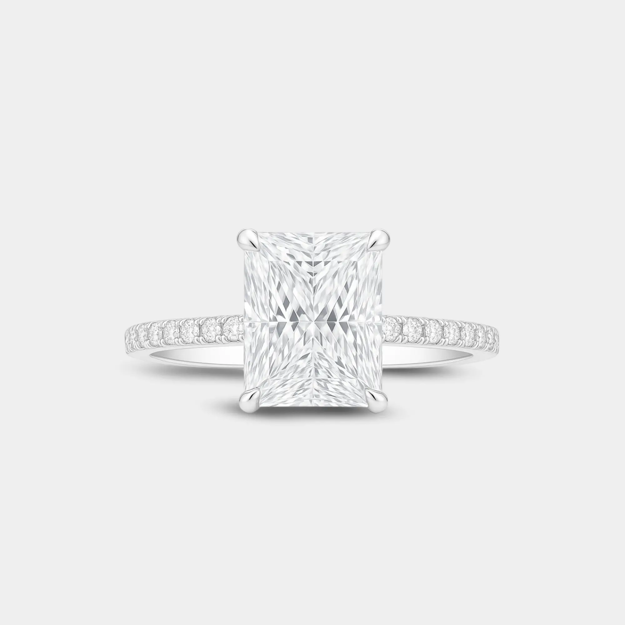 The classic four-prong setting securely holds the dazzling radiant-cut stone, while the petite band with accent stones adds brilliance and sophistication. Its rounded inner edge ensures maximum comfort, allowing you to wear it with ease all day.