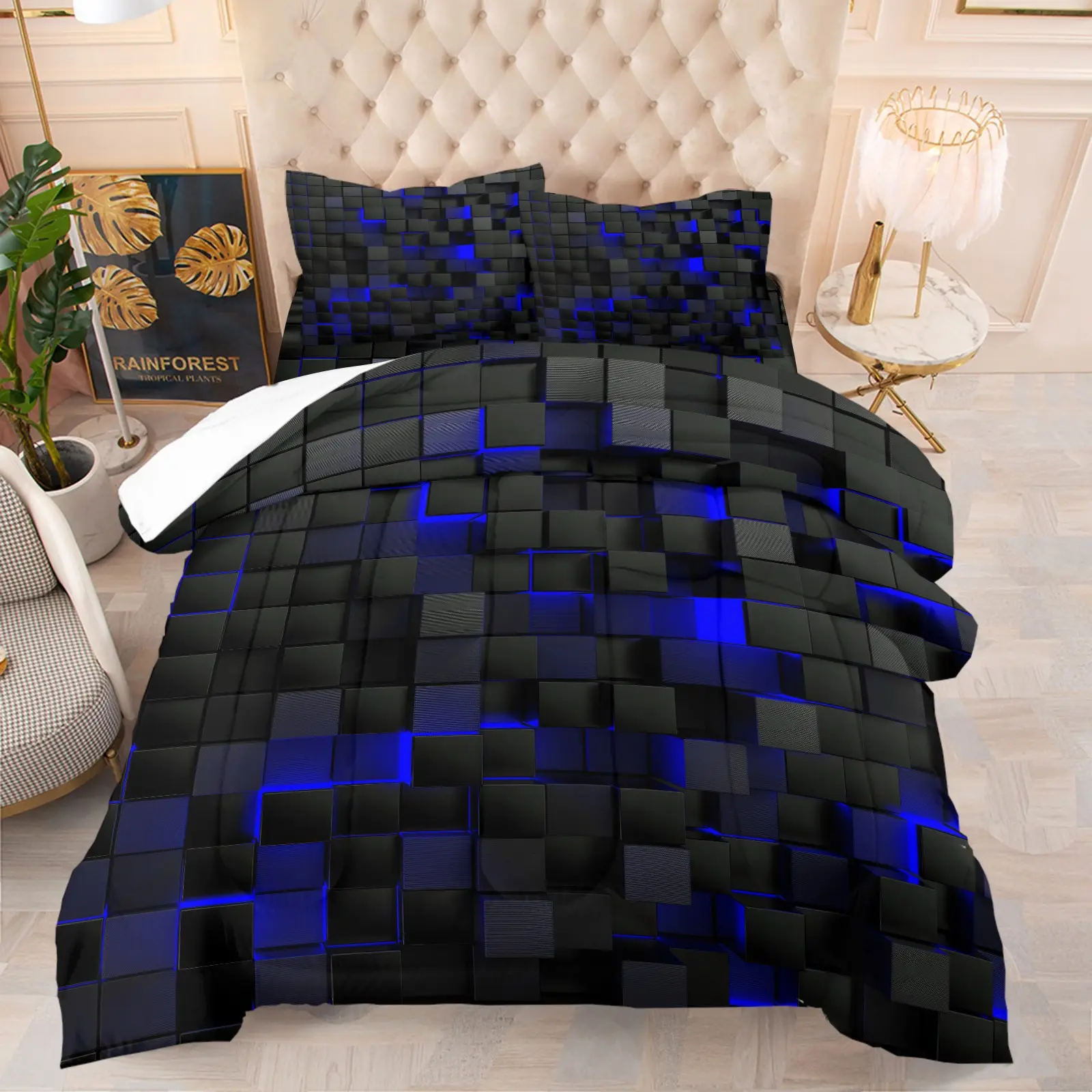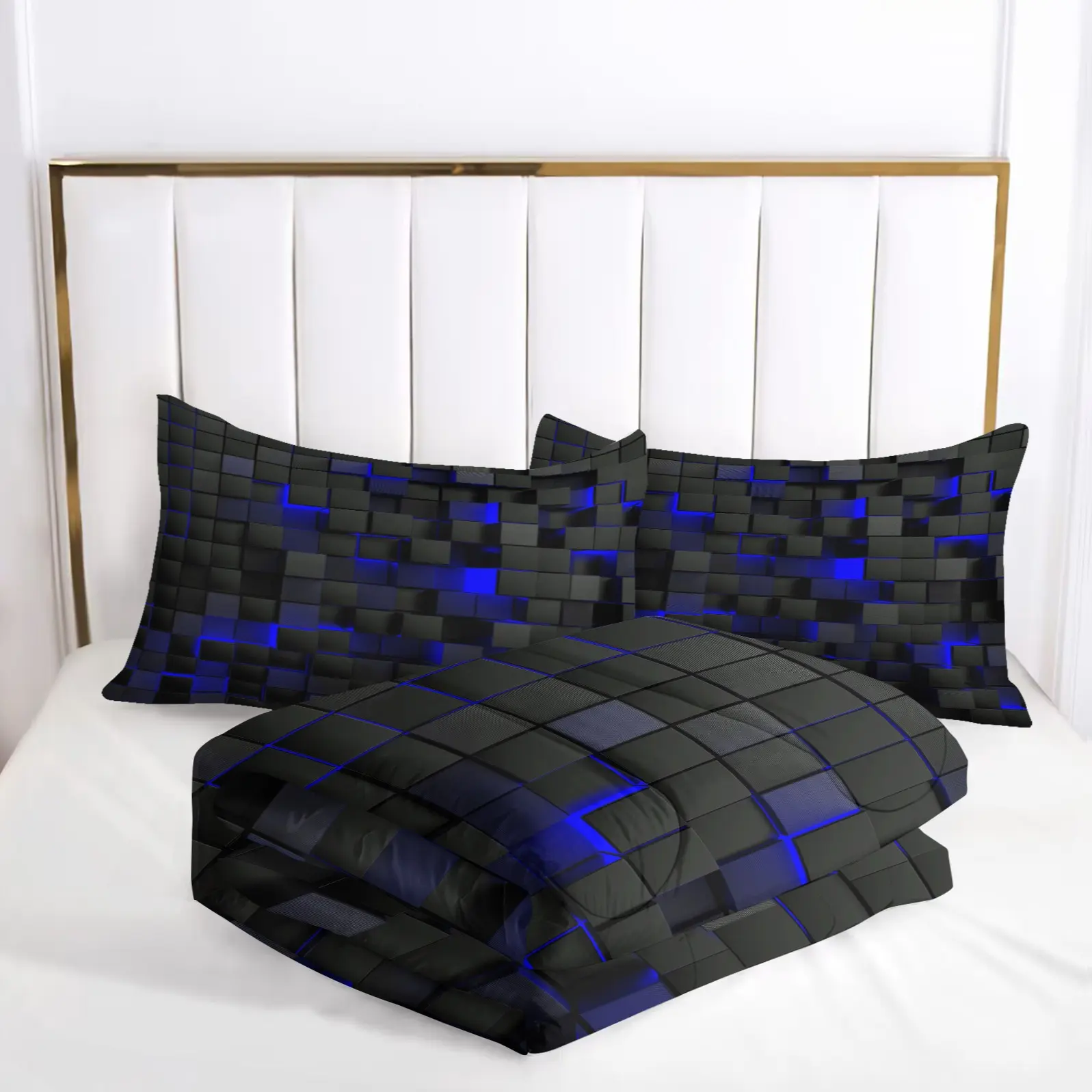 3D Blue & Black Cube Comforter Set - Durable Material Comfy Bed Sets, 1 Quilt + 1/2 Pillowcases, Modern Geometric Gaming Bedding for Teens & Gamers, Ideal for Bedrooms, Dorms & Guest Rooms