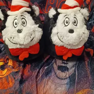 This is an exclusive Adult Cat in the Hat 3D Character Slippers.