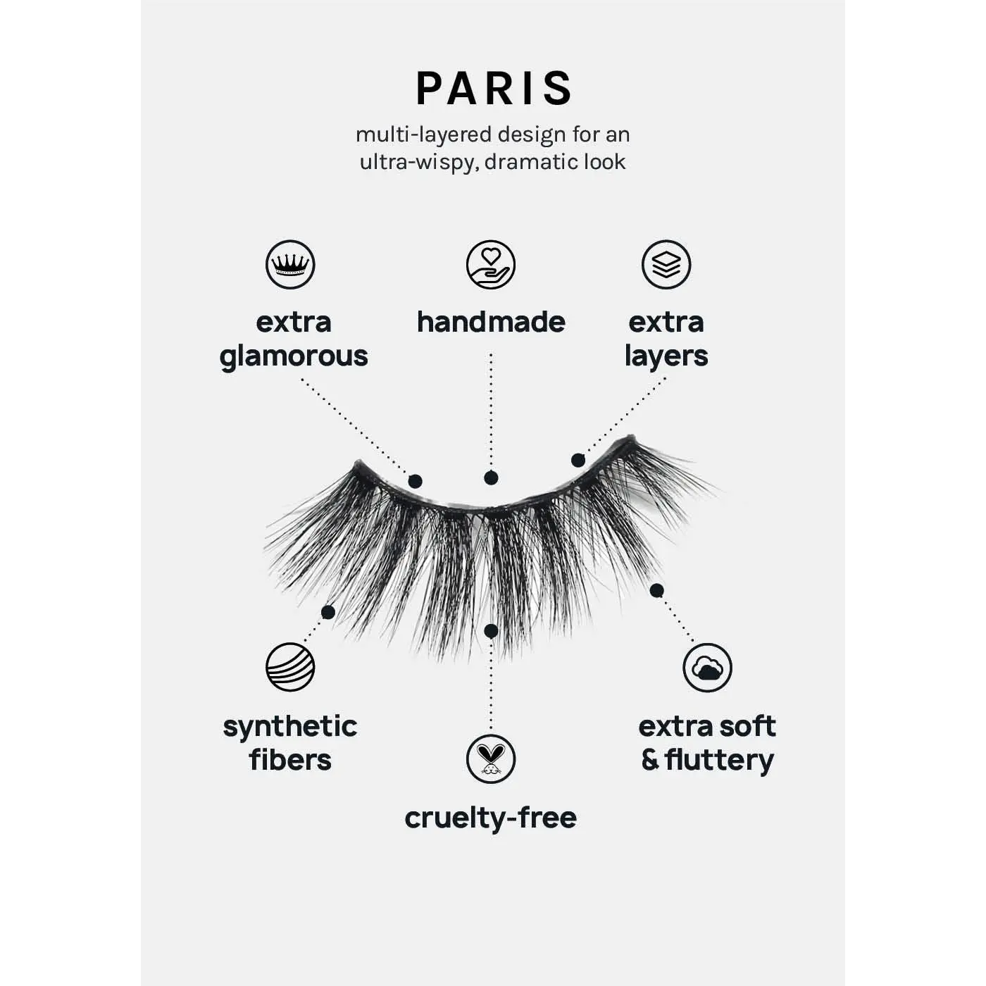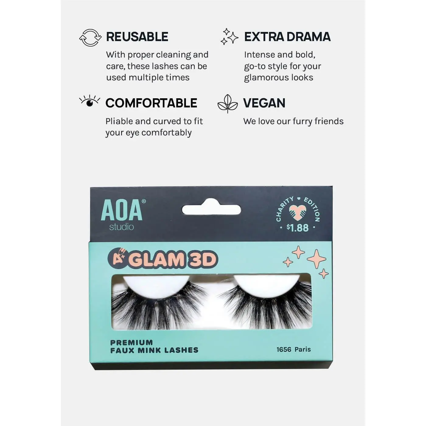 GLAM, super WISPY, + stacked, A+ Glam 3D Faux Mink Eyelashes are 100% Vegan fiber layered to add fluttery length + volume to all eye shapes. Features a wide lash band to last multiple wears.