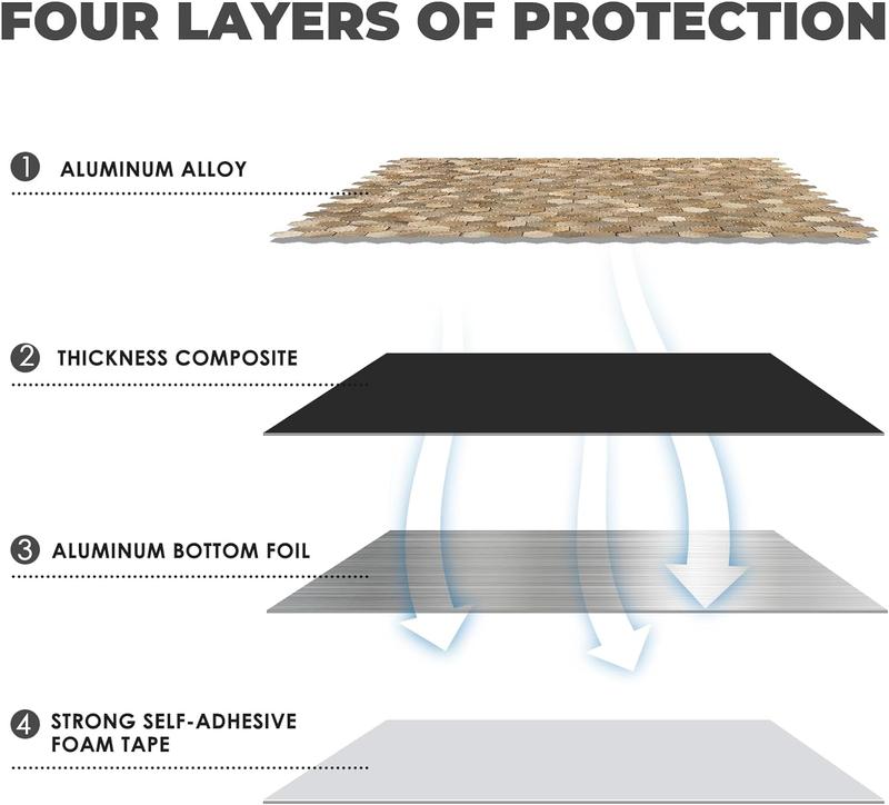 ·Premium Features: Made with aluminum materials with an elegant metallic brushed shine. Heat-resistant and moisture-resistant, suitable for installation on almost any wall surface at home. Easily wipe off stains, protecting the wall from water splashes and grease. Enhanced adhesive backing and thickened design make it superior to regular PVC tiles, more durable than plastic self-adhesive tiles