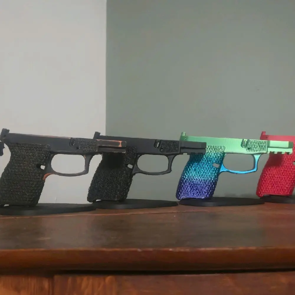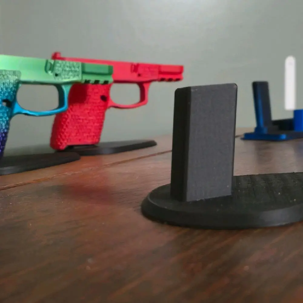* Simple and Sturdy Design: This 3D printed gun display stand is designed for simplicity and stability. It fits 9mm and 45mm caliber handguns. The stand is made from PLA+, the standard material, ensuring durability and reliability. 🏹